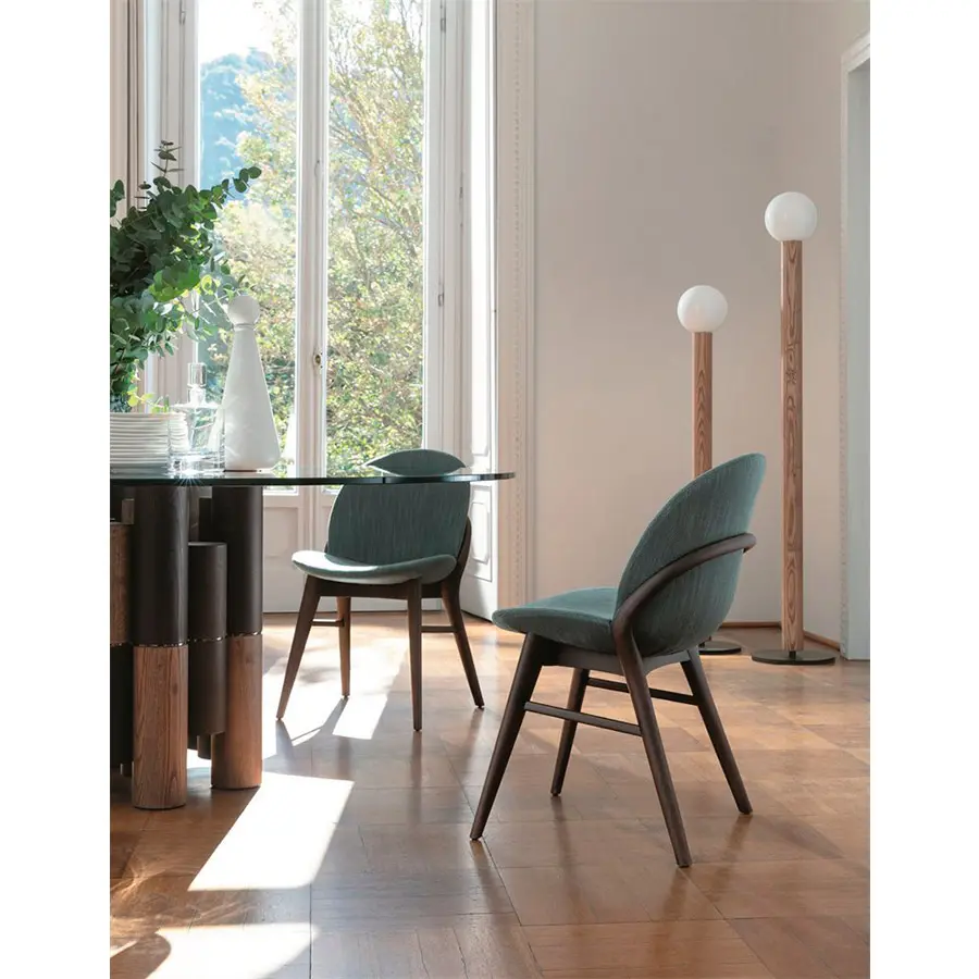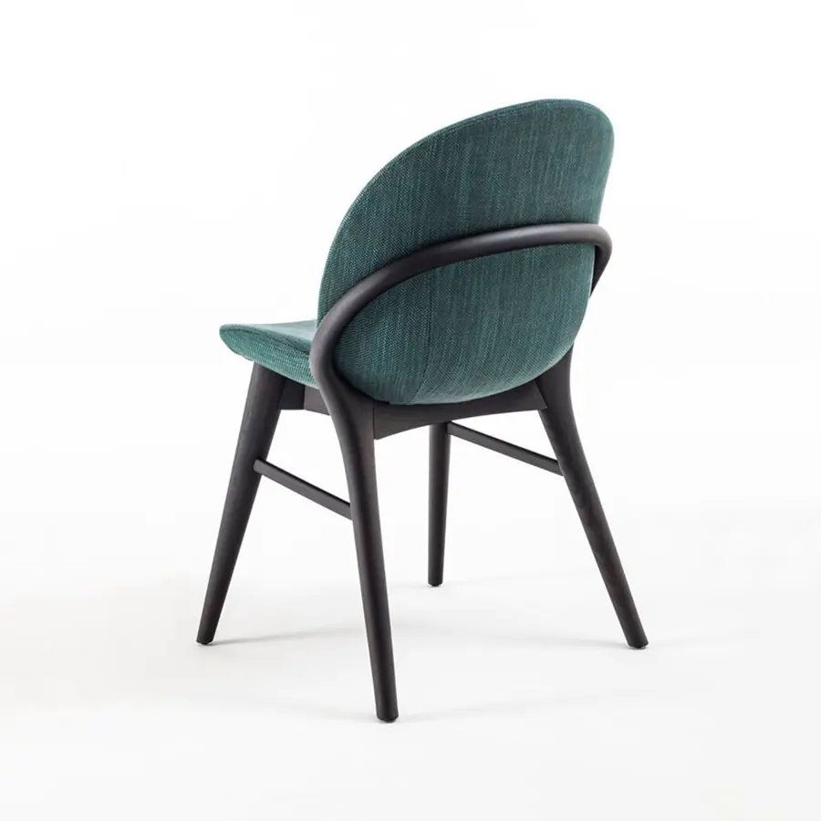 Lip es una silla de líneas redondeadas haciendola suave y sofisticada, se adapta a cualquier comedor o estancia de la casa. El detalle de su respaldo sin duda es de sus cualidades a destacar. Estructura en fresno macizo y revestimiento en las telas de la colección.