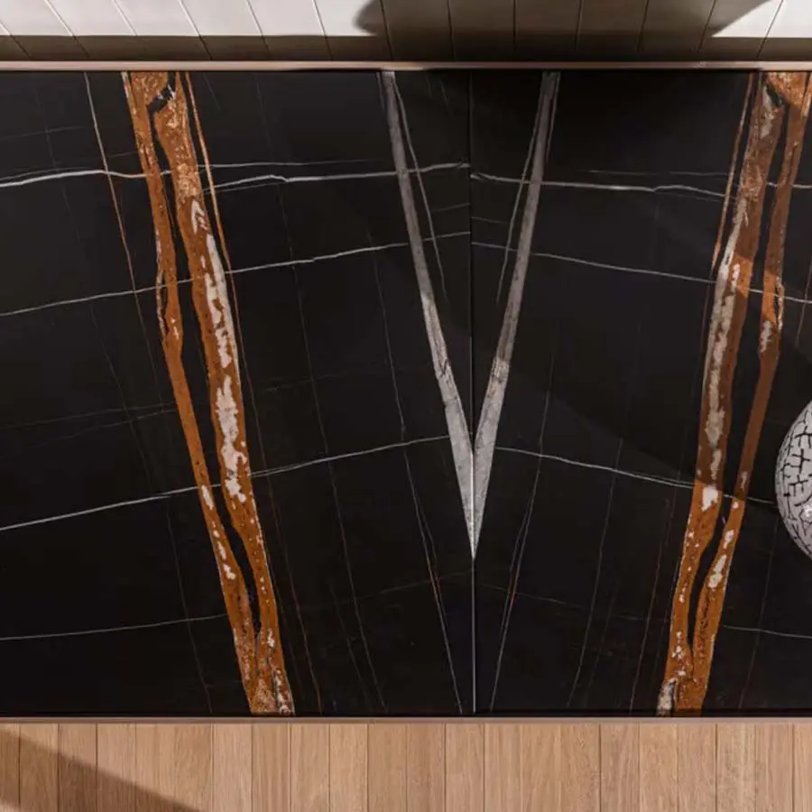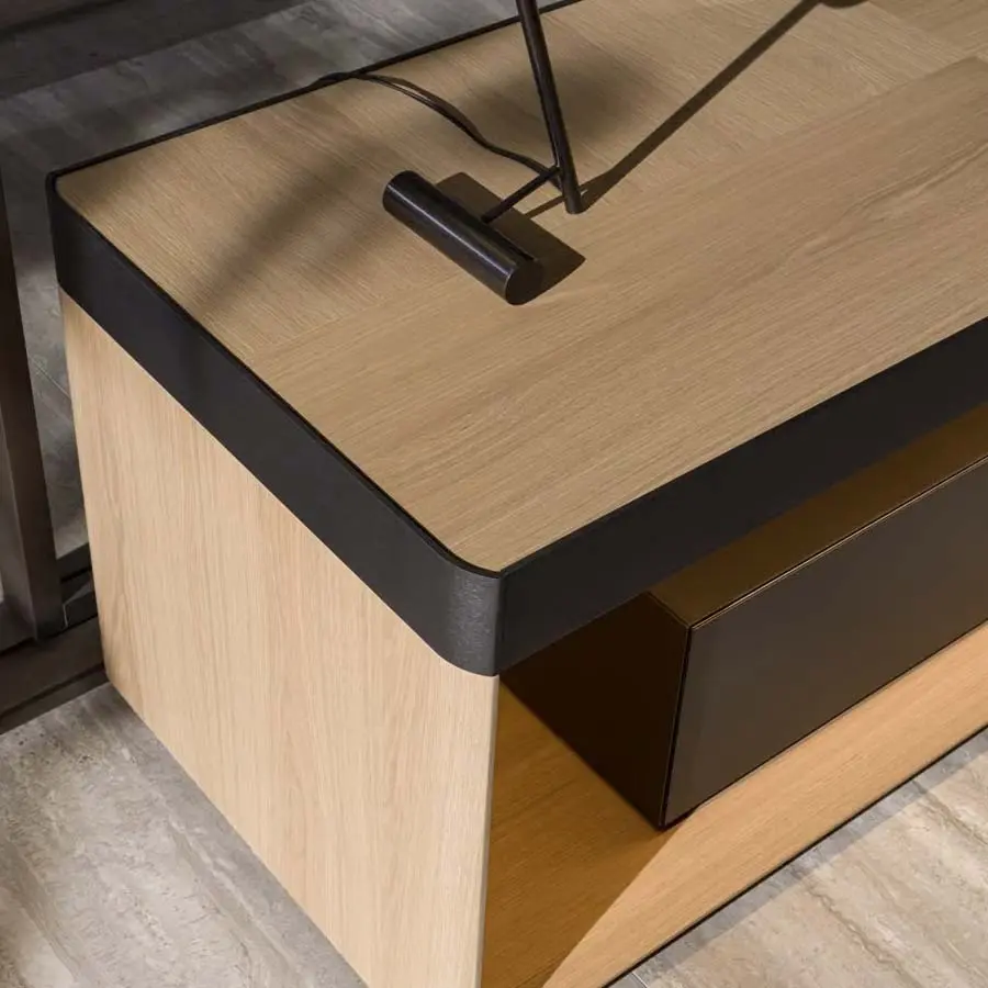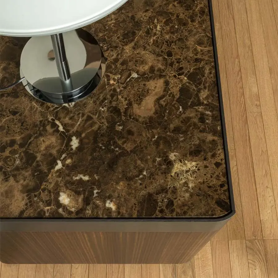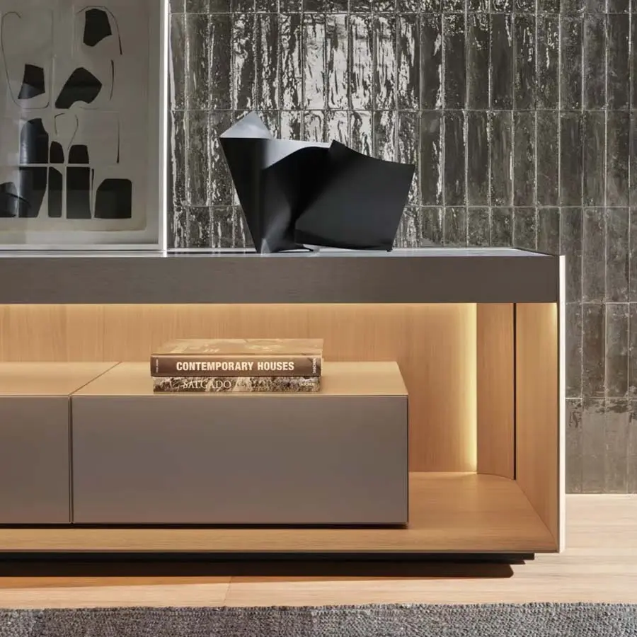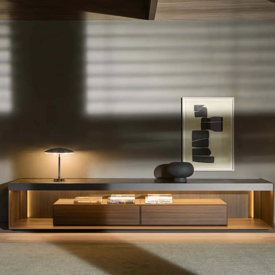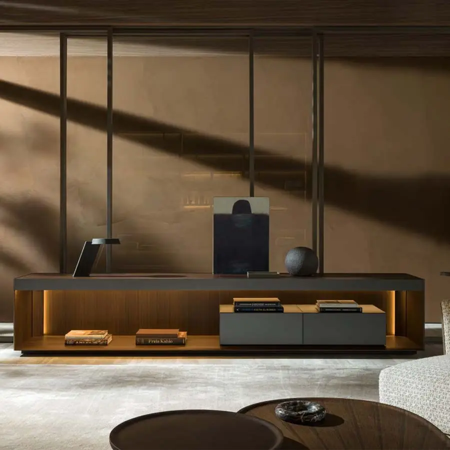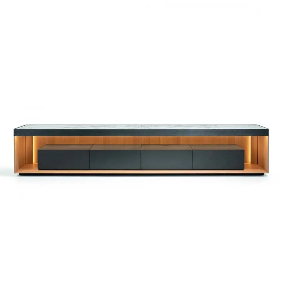 Living Box es un contendor rectangular, bajo, de gran tamaño (230, 280, 330, 380) y sin puertas, cuyo interior y exterior se contraponen mediante la utilización de materiales diferentes. El exterior se caracteriza por una superficie de apoyo amplia, donde los mármoles y las maderas se utilizan para decorar el tablero colocando los materiales utilizados conforme a unos dibujos geométricos muy peculiares. El mueble está encerrado dentro de un marco, en iris y color peltro, aparentemente muy fino si se mira desde arriba, pero que, de mirarse de frente, se transforma en un verdadero perfil de espesor importante que marca el módulo interno.