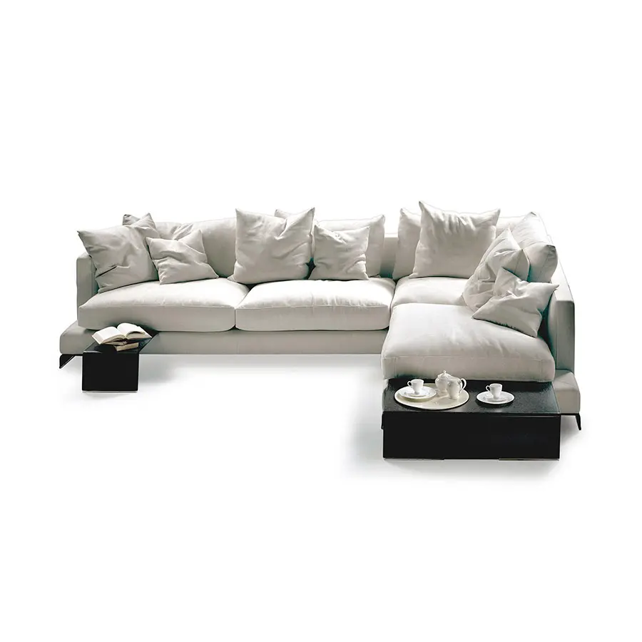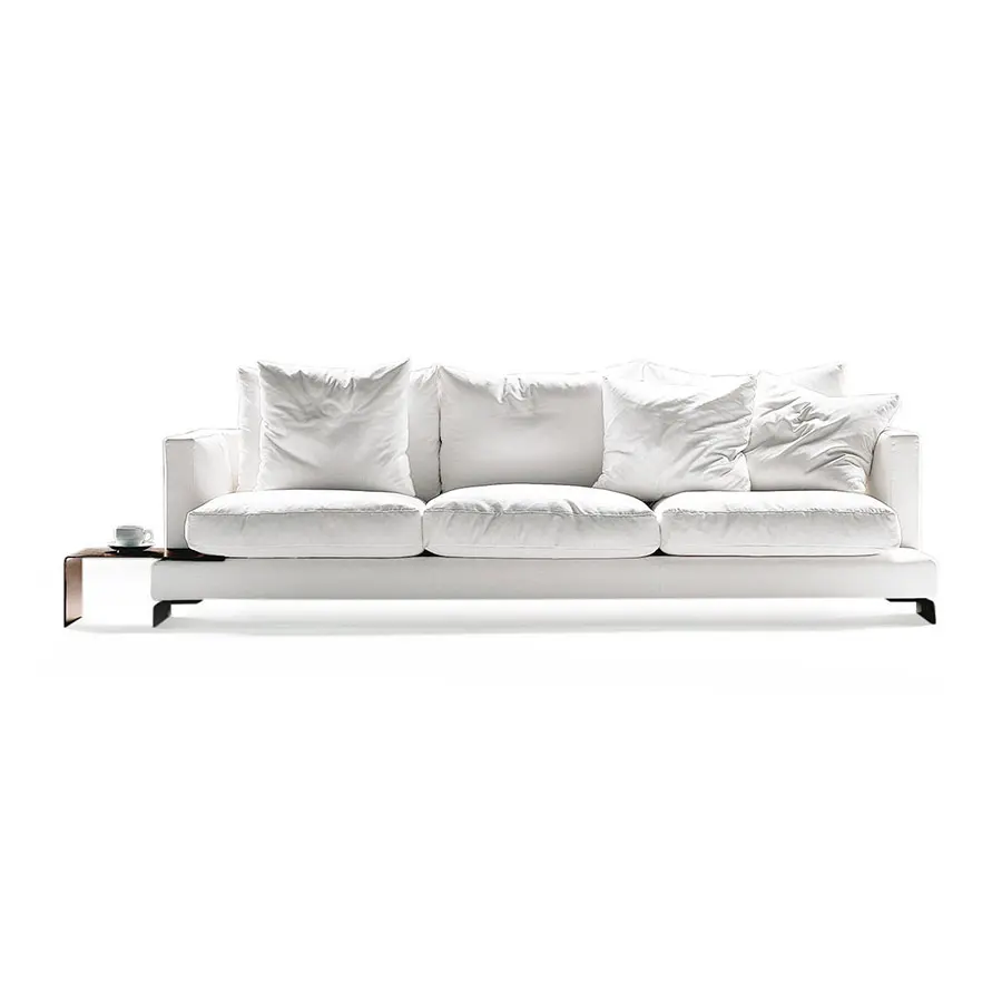 El sistema de asientos Long Island se caracteriza por el diseño del reposabrazos, que está ligeramente alejado del asiento y de 111 cm de profundidad, con un relleno de pluma de oca con un inserto no deformable o bien en poliuretano y dacrón, lo que permite adoptar una postura particularmente cómoda y relajada. La base del sofá ha sido especialmente diseñada para permitir la inserción de unas prácticas mesillas auxiliares caracterizadas por una línea esencial pero preciosas por el revestimiento de cuero. La sección en forma de «L» de las mesillas recuerda la de los pies metálicos, disponibles en los acabados satinado, cromado, bruñido, cromado negro y champán, o recubiertos de cuero, combinados con las mesas de centro. El modelo Long Island 05 se caracteriza por unos pies retráctiles.