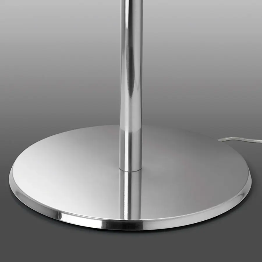 Lámpara de mesa de luz directa y difusa. Difusor en vidrio encamisado con acabado brillante, soplado a boca, blanco en el interior y de color en el exterior. Base y poste en vaciado a presión de aluminio acabada y abrillantada a mano en la versión aluminio, pintada con líquido en la versión cromo negro. Interruptor con dimmer que permite una regulación gradual.