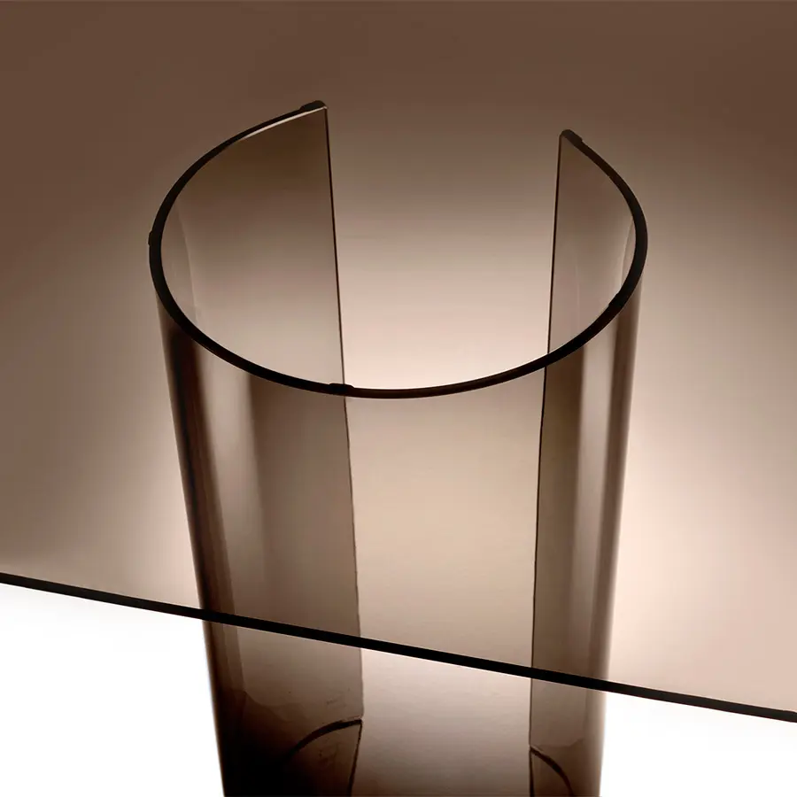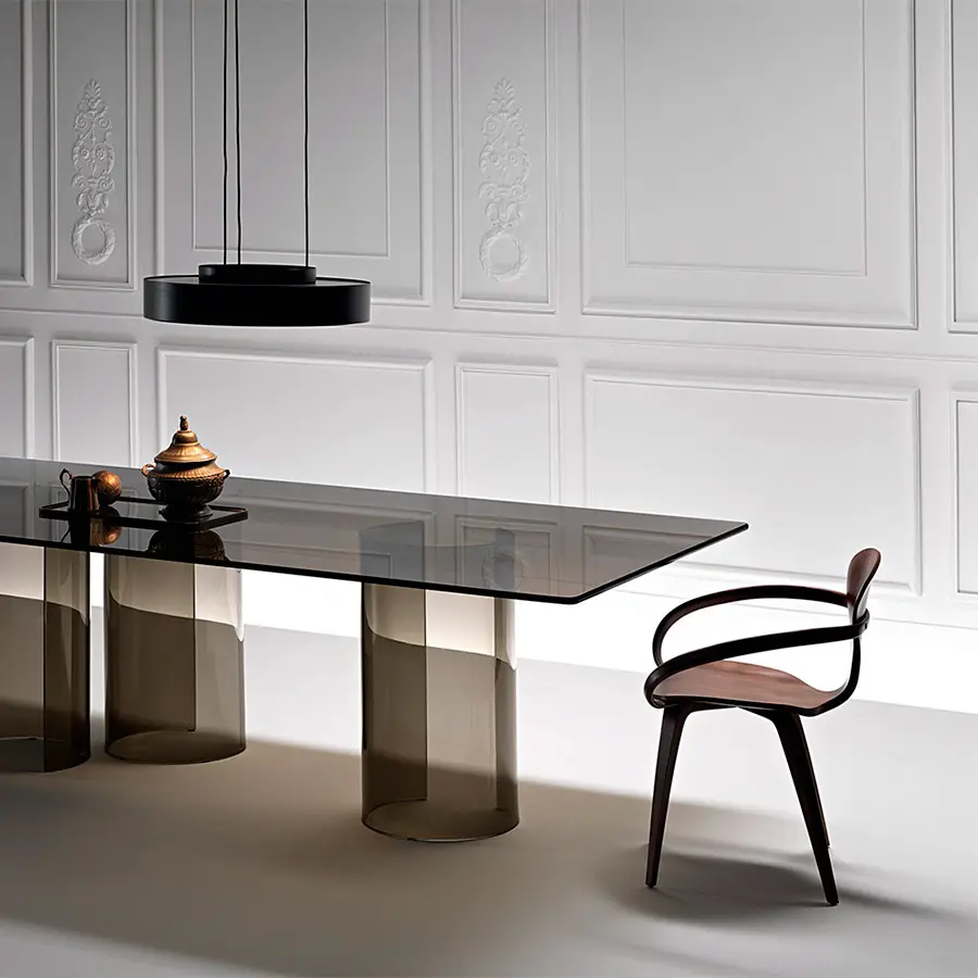 Mesa de comedor con encimera de vidrio en capas con borde pulido brillante de 8 + 8 mm de espesor. También disponible en vidrio ahumado o bronce, o bien transparente extraligero. La base es de vidrio curvado de 10 mm de espesor, compuesta de 2, 3 o 4 cilindros (Ø 40 cm) dependiendo del tamaño y la forma solicitada. También disponible con tapas de tamaño personalizado.