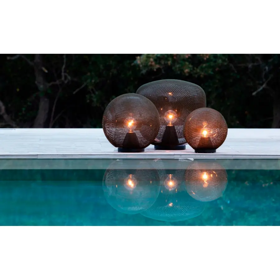 Madame Latoque es una lámpara de punto, irradia una gran presencia por sí mismas, pero también se pueden agrupar mezclando tamaños y tejidos para que brillen en un hermoso conjunto. es una colección de iluminación para exterior con un característico tejido de punto y croché. El diseñador belga Ilia Eckardt creció inmerso en el ambiente de la moda belga, experimentando con innovadoras técnicas de punto y cuerda impermeable. Sus lámparas de pie en forma de globo proporcionan una luz cálida y filtrada y proyectan hermosas sombras.