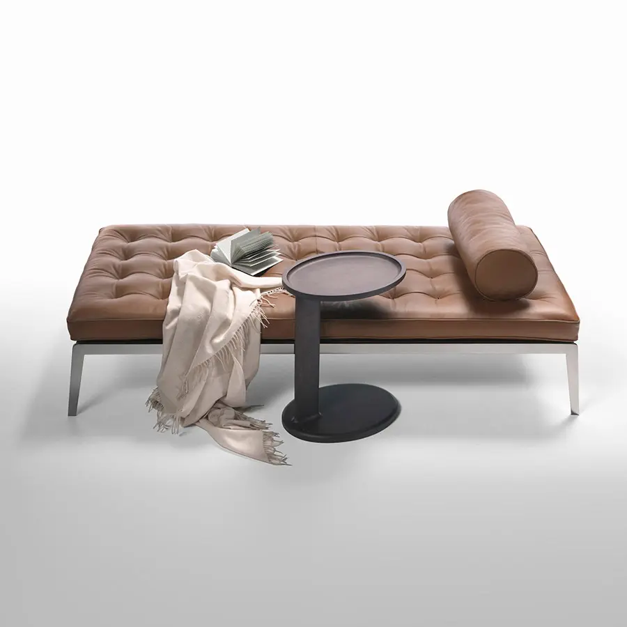 Diseñado en 2014, el sofá-cama Magi es un homenaje al sofá Magister, considerado con razón como un producto emblemático de la empresa. Este elegante sofá-cama retoma la especial confección del capitoneé: el botón tradicional del acolchado clásico se sustituye aquí por un ojal más moderno con dos orificios. Este detalle refinado de confección acentúa el carácter gráfico del acolchado y la capacidad adquirida por la empresa para ejecutar procesos particularmente complejos. El sofá-cama Magi se eleva del suelo mediante una base metálica esencial y puede equiparse con un práctico cojín de rodillo.