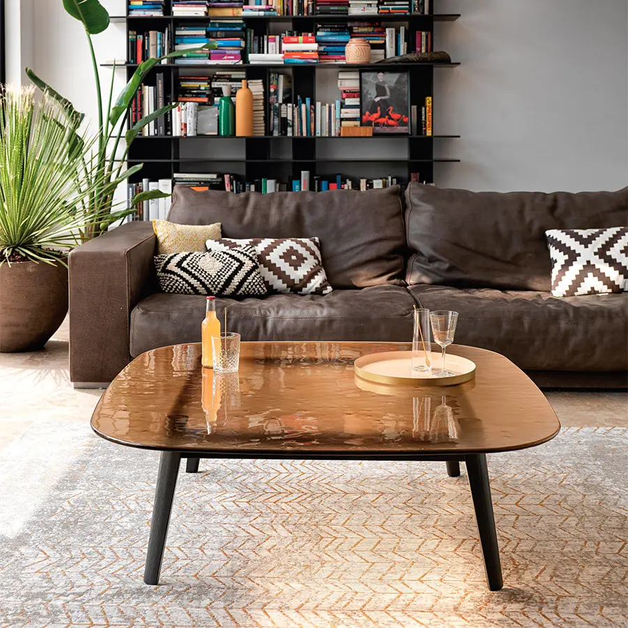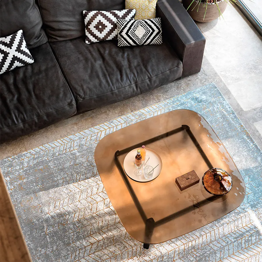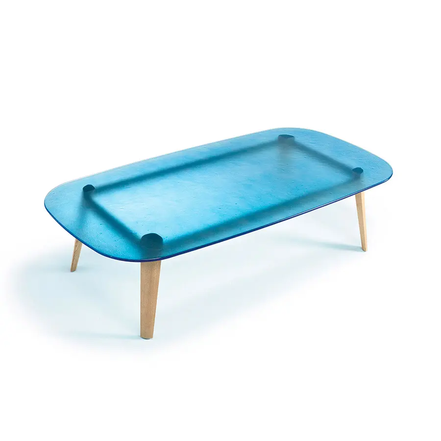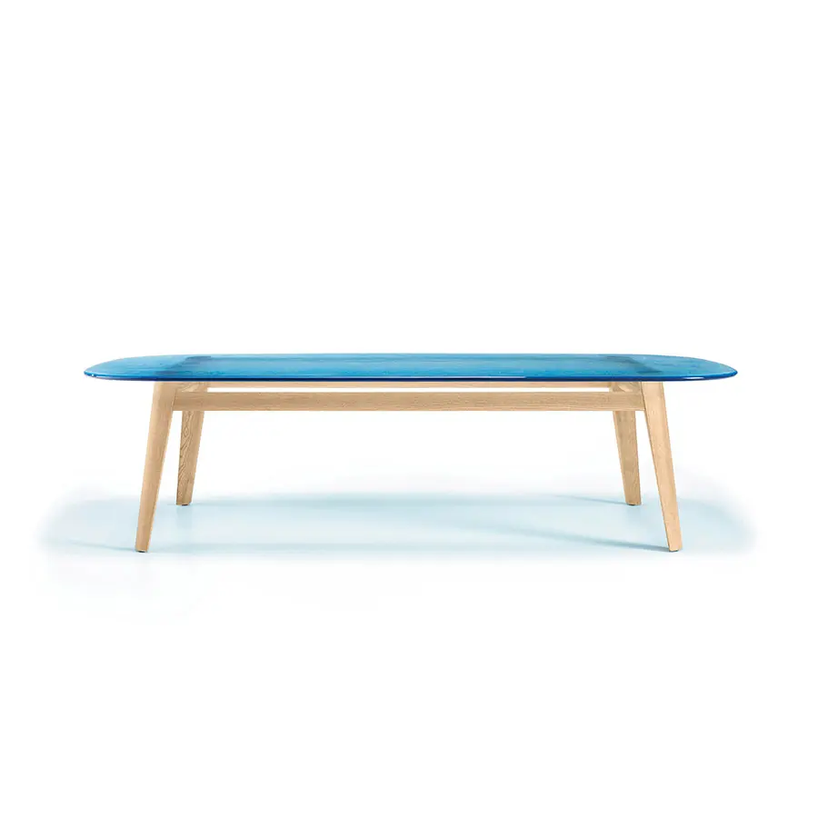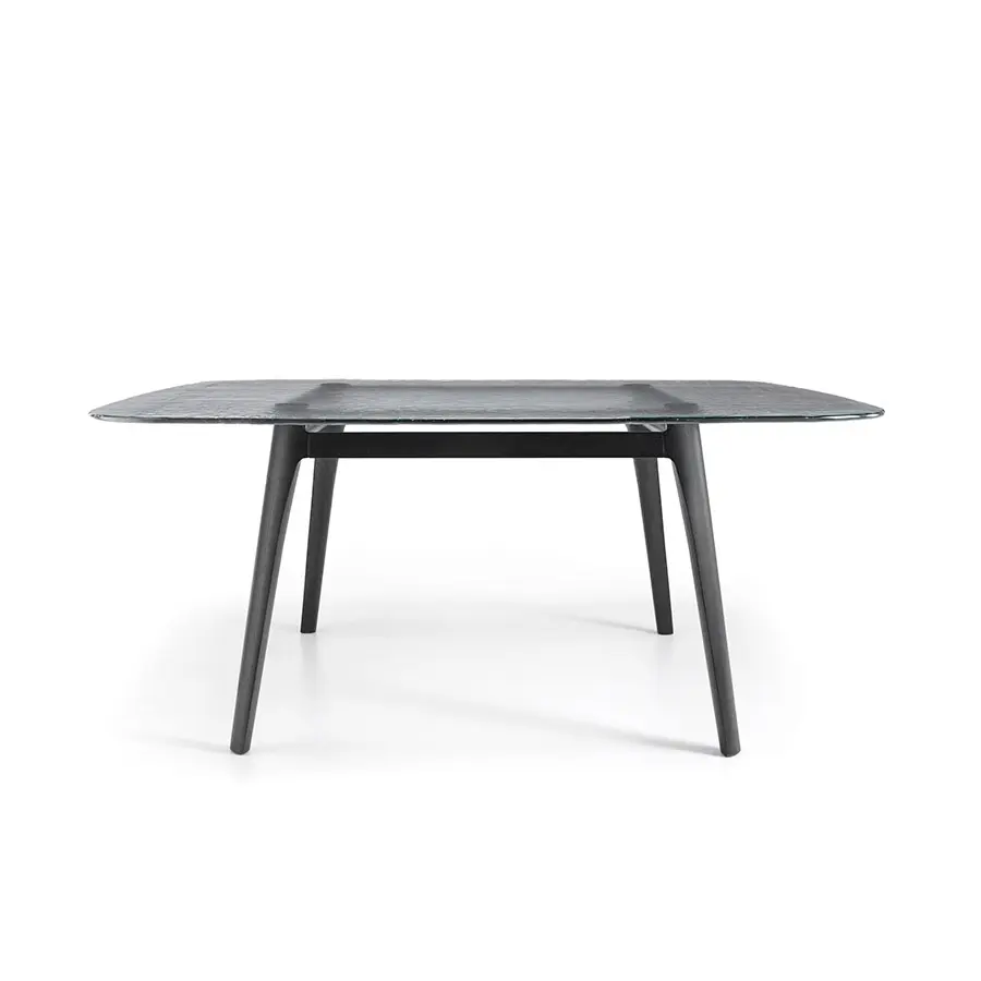 Mesa con tapa de vidrio de 12 mm fundido y templado, disponible en coloresHumo, Azúl, Ámbar o Natural efecto satinado. Estructura en madera de roble maciza disponible en los acabados natural o color gris.