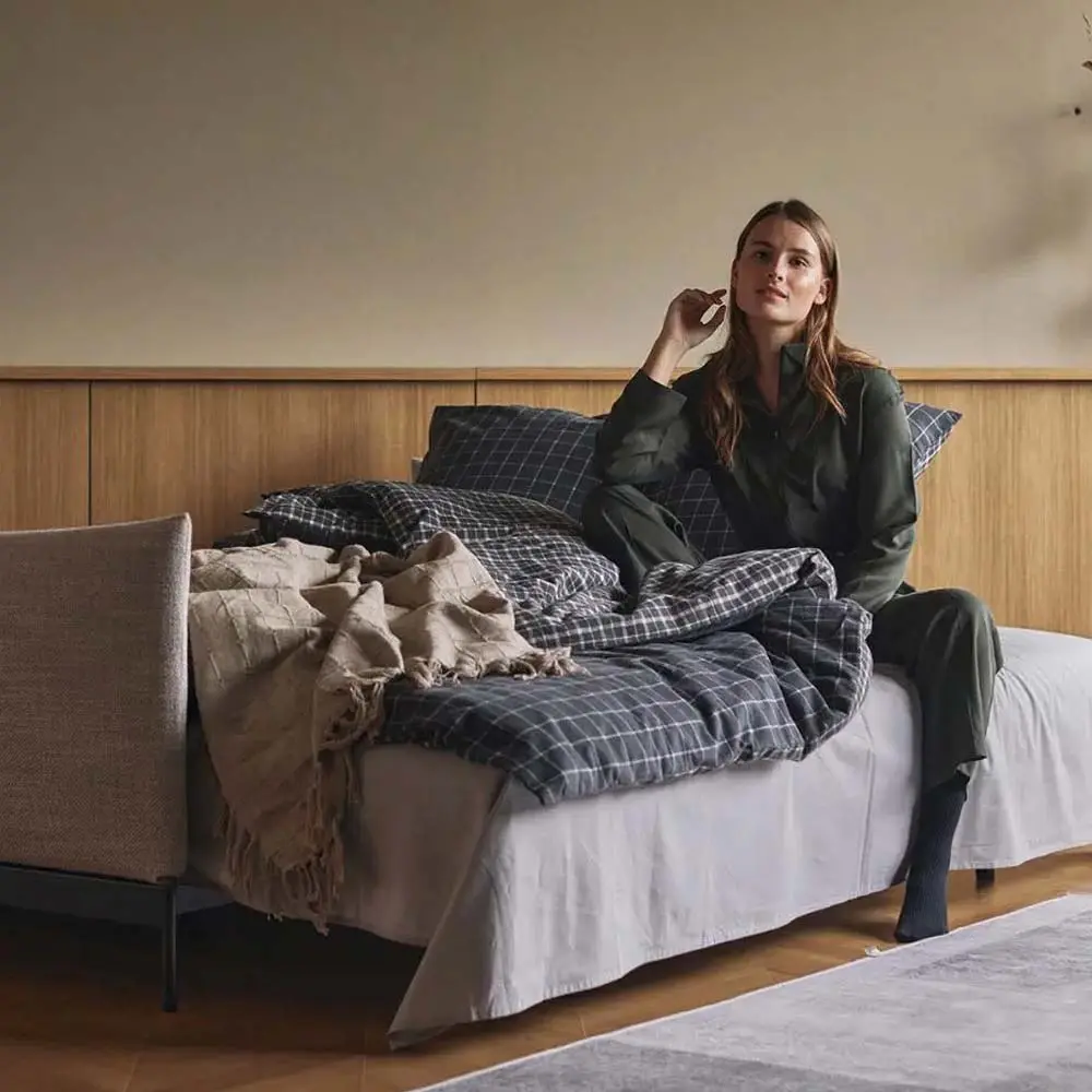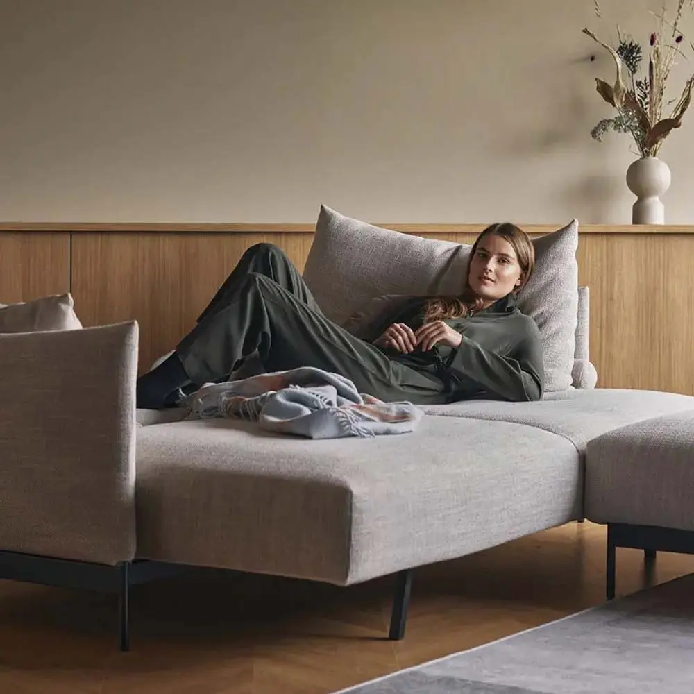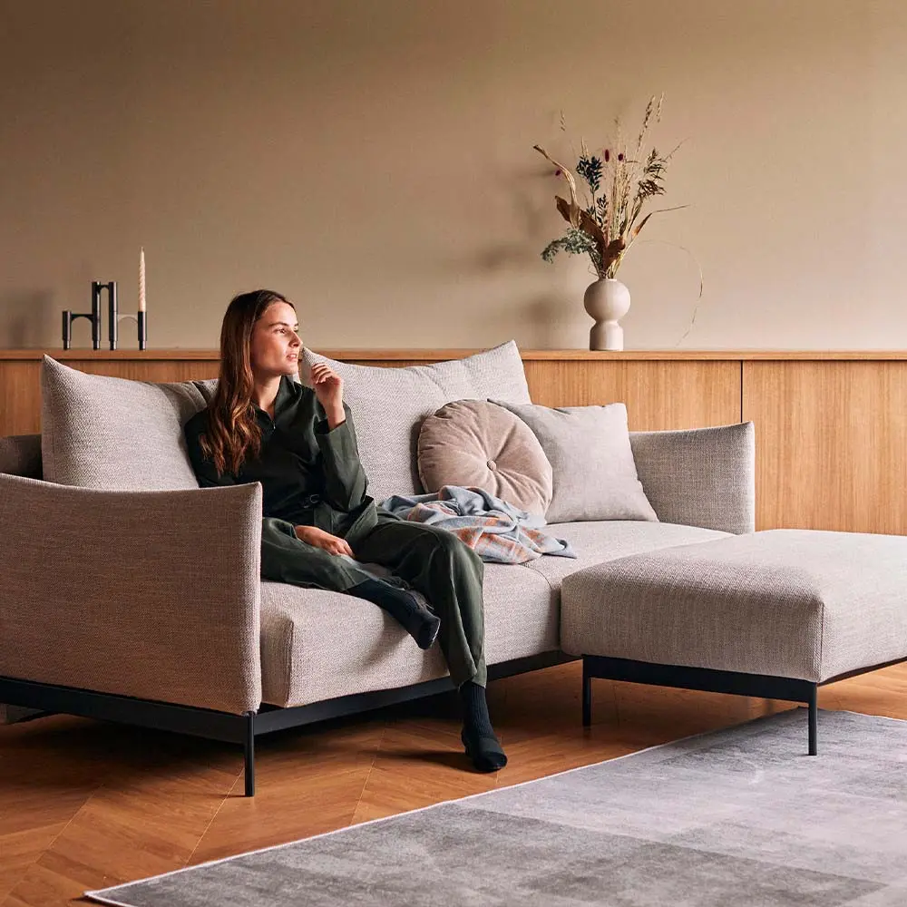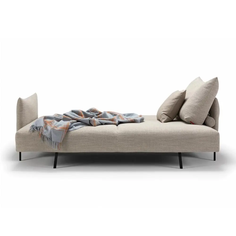 Gracias a su mecanismo intuitivo, el sofá se convierte en una cama de matrimonio amplia (150×200 cm) en segundos, ideal tanto para uso ocasional como frecuente. Su base metálica y su tapizado en tejidos resistentes hacen de Malloy una pieza pensada para durar y convivir con el día a día. Disponible en varios colores de tapizado y con opción de añadir pufs o cojines modulares, Malloy se adapta tanto a interiores relajados como a propuestas más sobrias y elegantes. Es una solución ideal para quienes desean una cama extra sin renunciar a la imagen cuidada del salón.