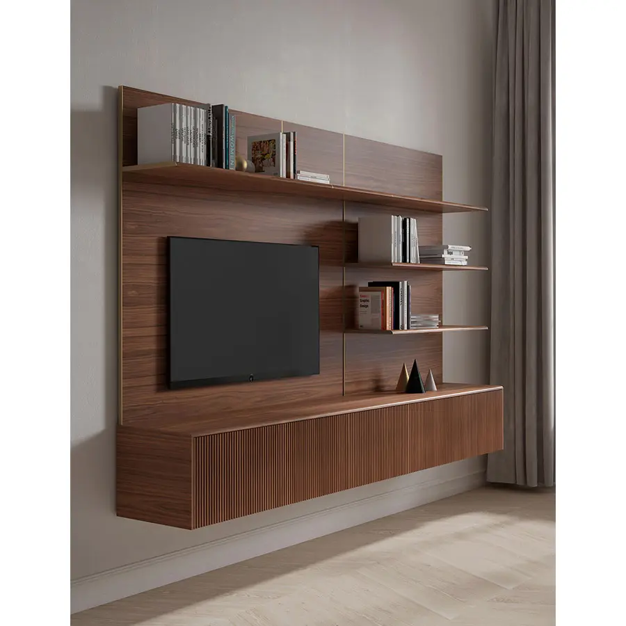 Malmö storage System es una colección de estantes y paneles para Televisión que visten paredes generando una elegancia al espacio gracias a una malla continua de calidad suprema.