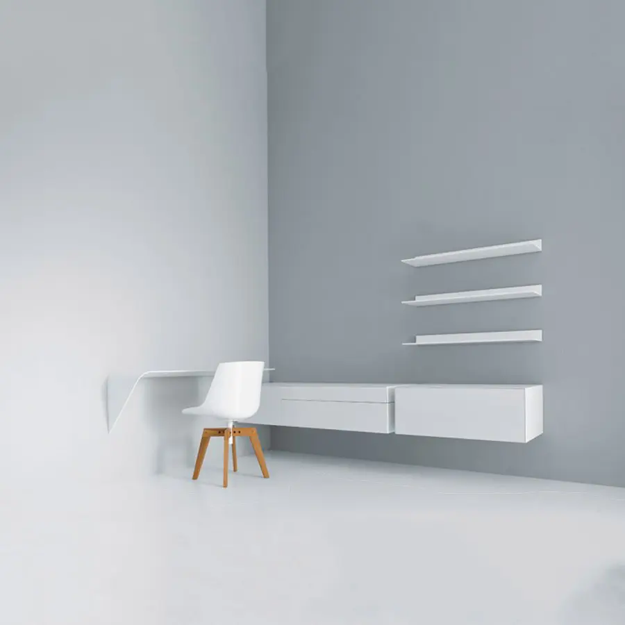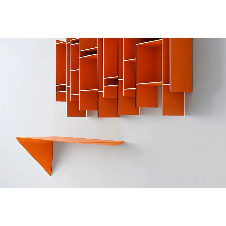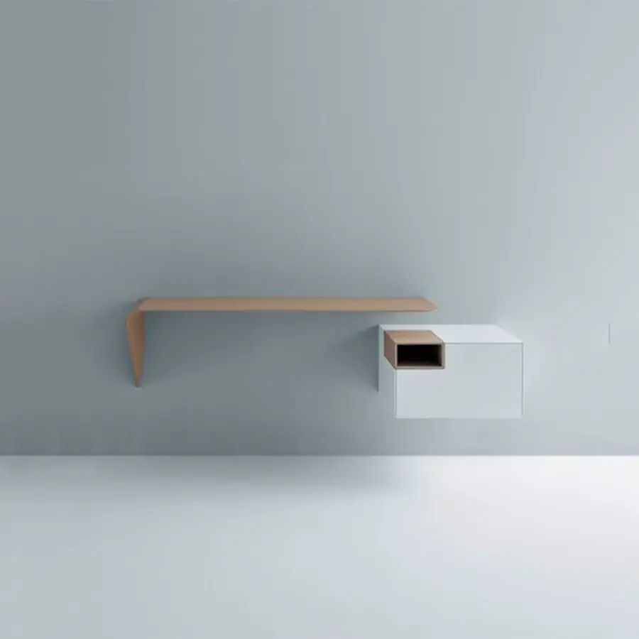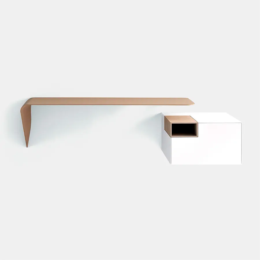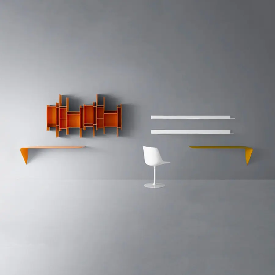 Estantería y / o escritorio de pared. La forma mínima y el grosor cónico crean un producto con un diseño único y altamente icónico. Es un «acento» que puede interactuar espontáneamente con su entorno y utilizarse de muchas maneras diferentes.