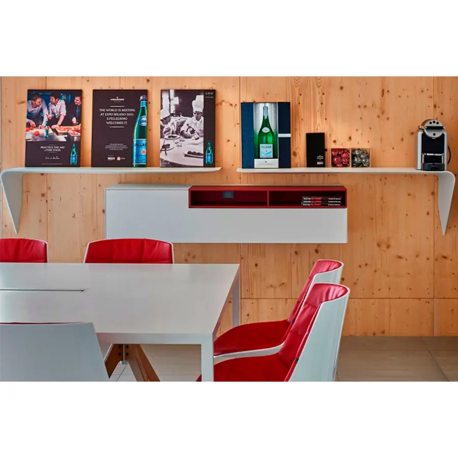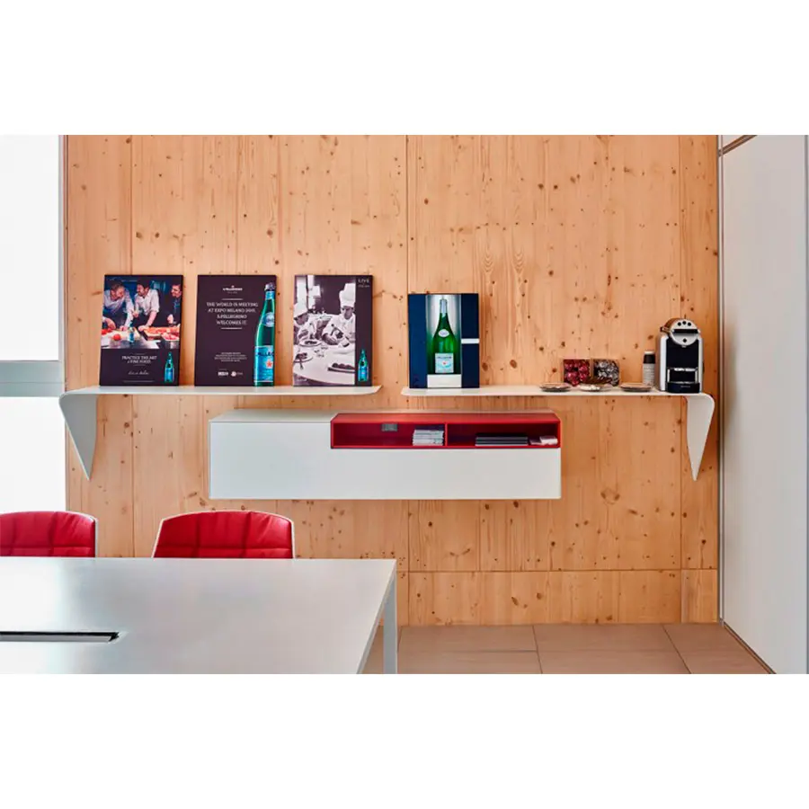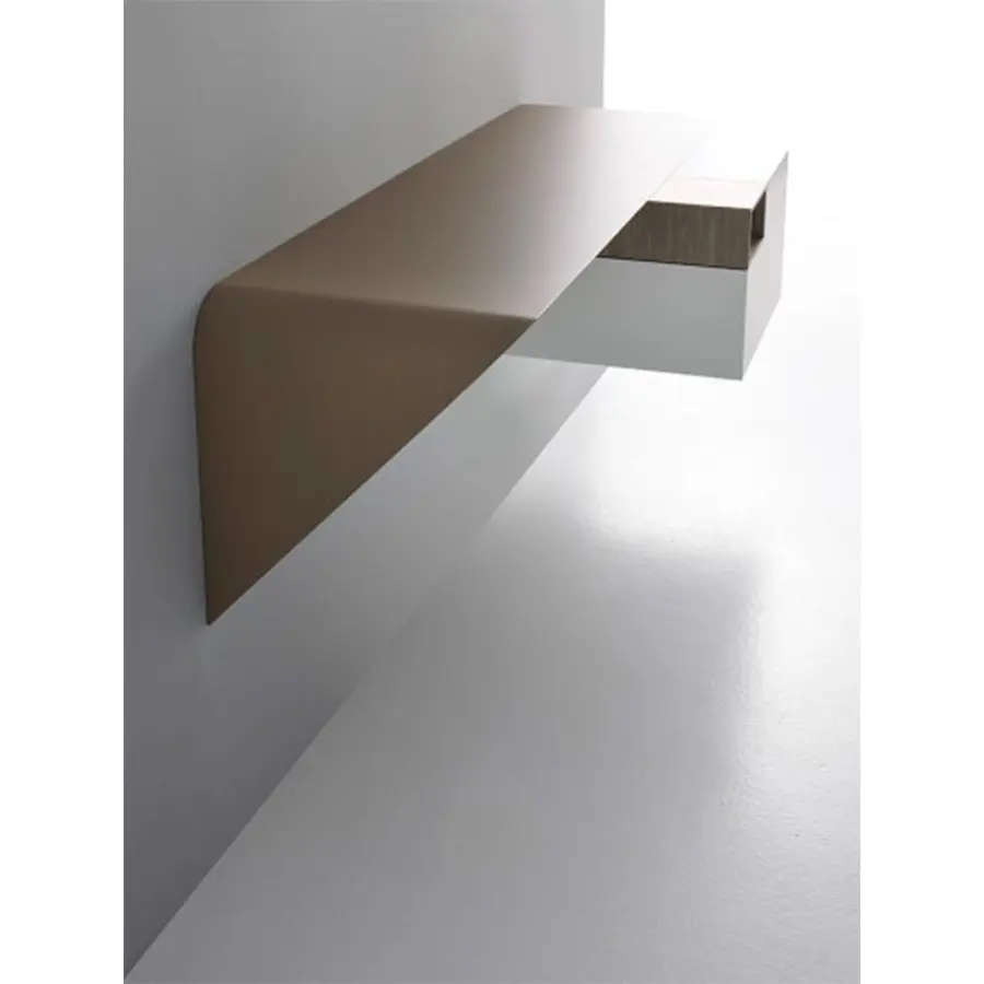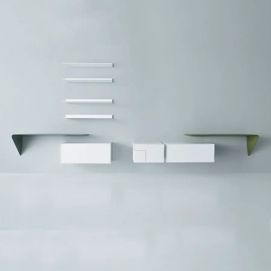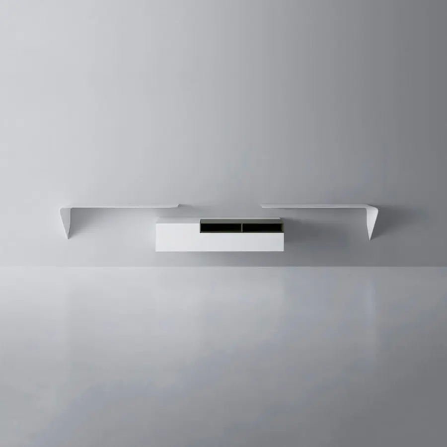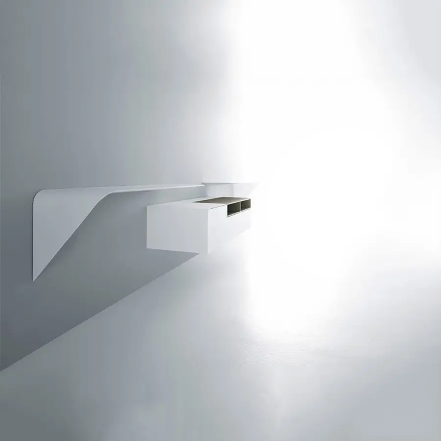 Estantería y / o escritorio de pared. La forma mínima y el grosor cónico crean un producto con un diseño único y altamente icónico. Es un «acento» que puede interactuar espontáneamente con su entorno y utilizarse de muchas maneras diferentes.