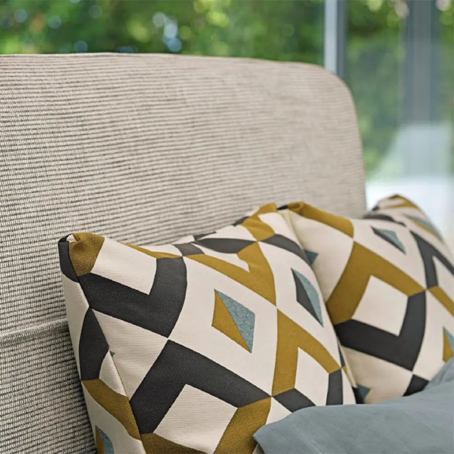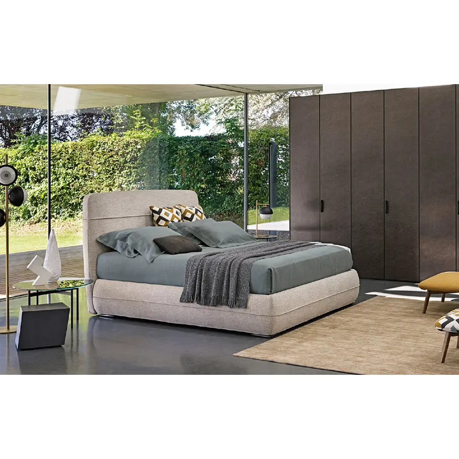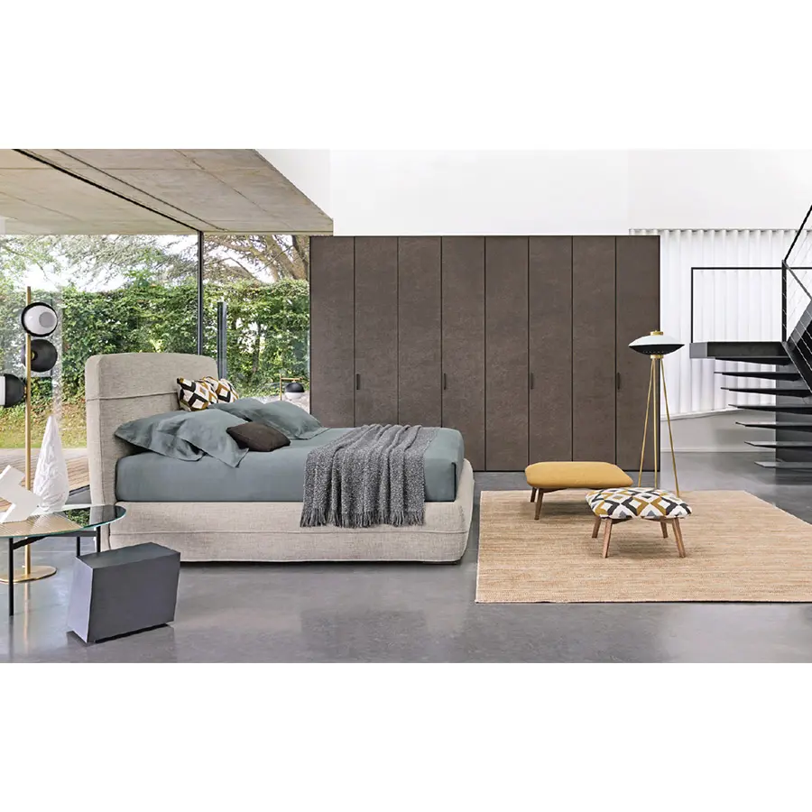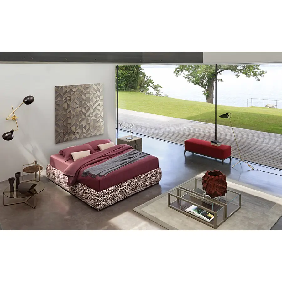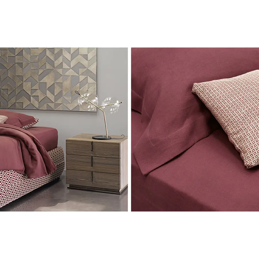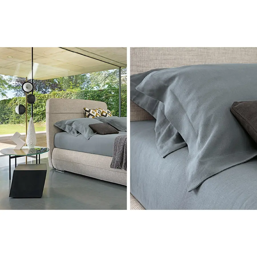 Cama refinada, de inspiración oriental, ideal para ambientes tanto clásicos como modernos. La base se distingue por un vivo horizontal, a lo largo de todo su perímetro, y que rompe la percepción de su altura remarcable: 38 cm del piso, dos más respecto a los somieres y las camas tradicionales. El mismo dibujo decorativo lo encontramos en la cabecera, a 2/3 de la altura. Mandarine se ofrece también en la versión somier, sin cabecera, que se puede enriquecer en pared con drapeados, cuadros, cortinas y boiserie. En ambas versiones está disponible con base de muelles Leonardo, base contenedor o base fija con somier de lamas regulables y pies de níquel negro brillo.