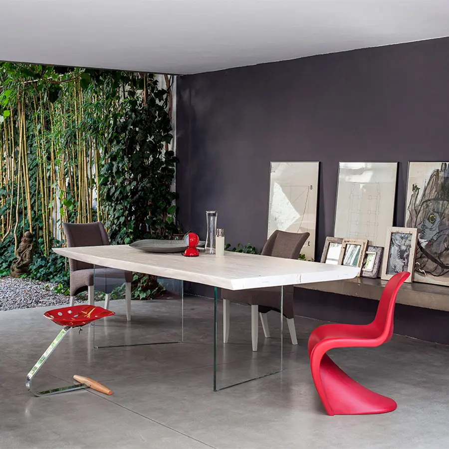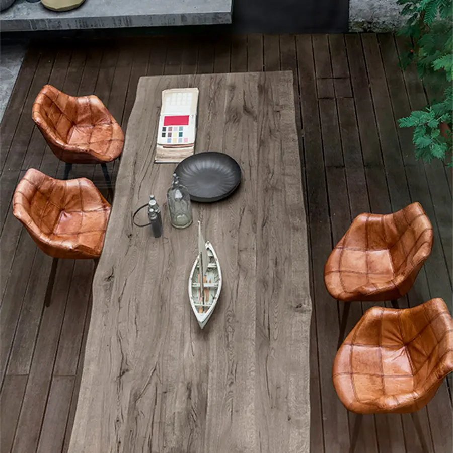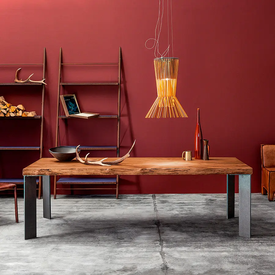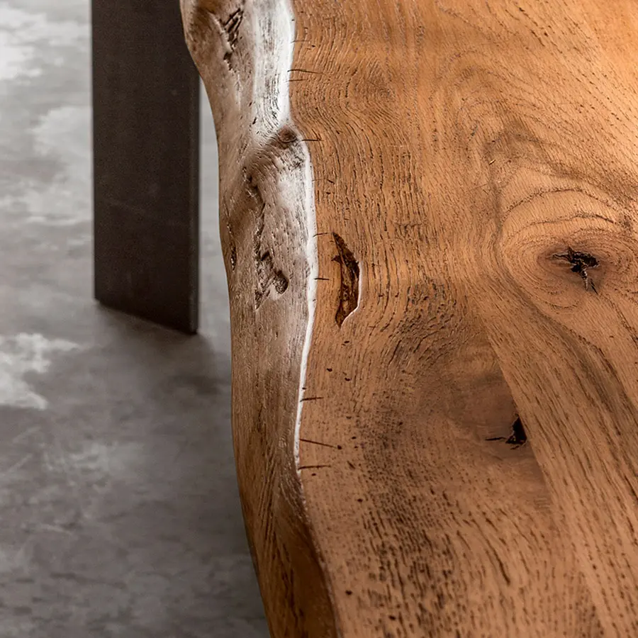 Puedes elegir patas entre las variantes de madera que garantizan la continuidad con la parte superior, el hierro en todos sus acabados, para crear un contraste agradable o el vidrio para aligerar la estructura, consiguiendo que casi desaparezca, con el objetivo de embellecer aún más la nobleza de la encimera de madera maciza.