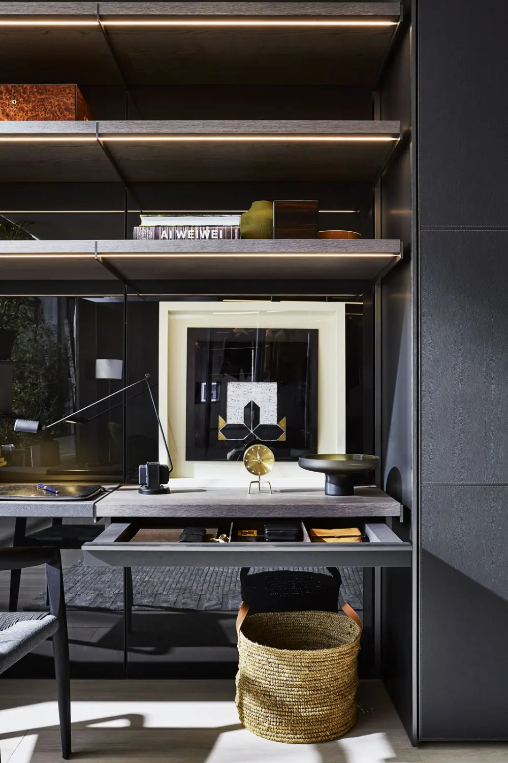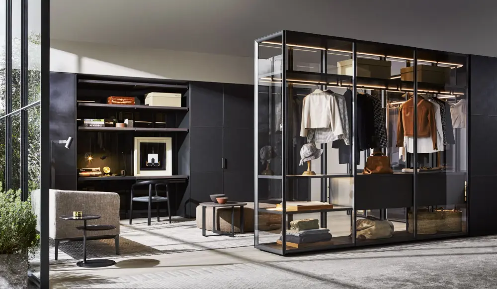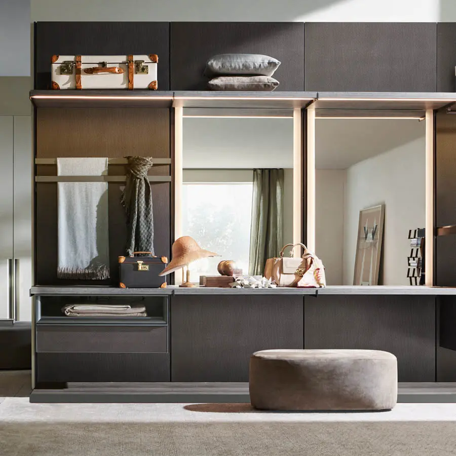 El sistema de vestidores empotrados Molteni Master Dressing te permite diseñar composiciones a medida con soluciones lineales y de esquina. Un sistema de estantes y soportes montados en la pared te permite suspender diversos equipos internos, como estantes, barras para perchas, unidades de cajones, estantes de ecopiel, y accesorios para corbatas y pañuelos. Una novedad absoluta es el compartimento «Vanity», equipado con un gran espejo retroiluminado con LED.