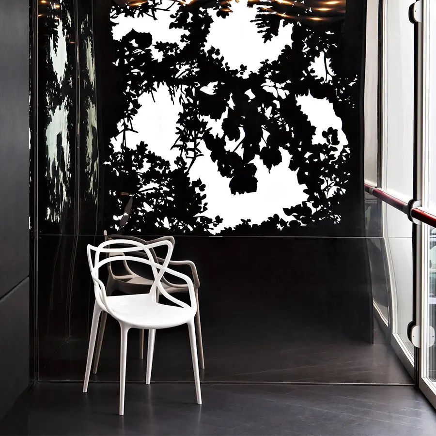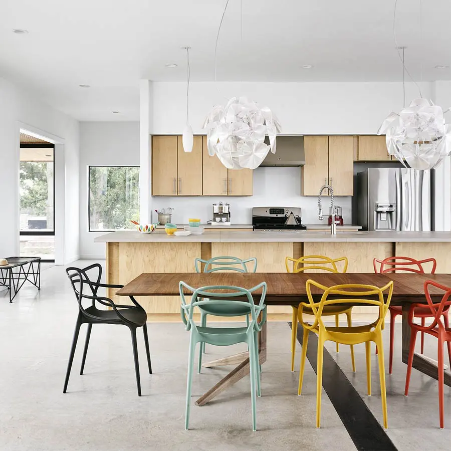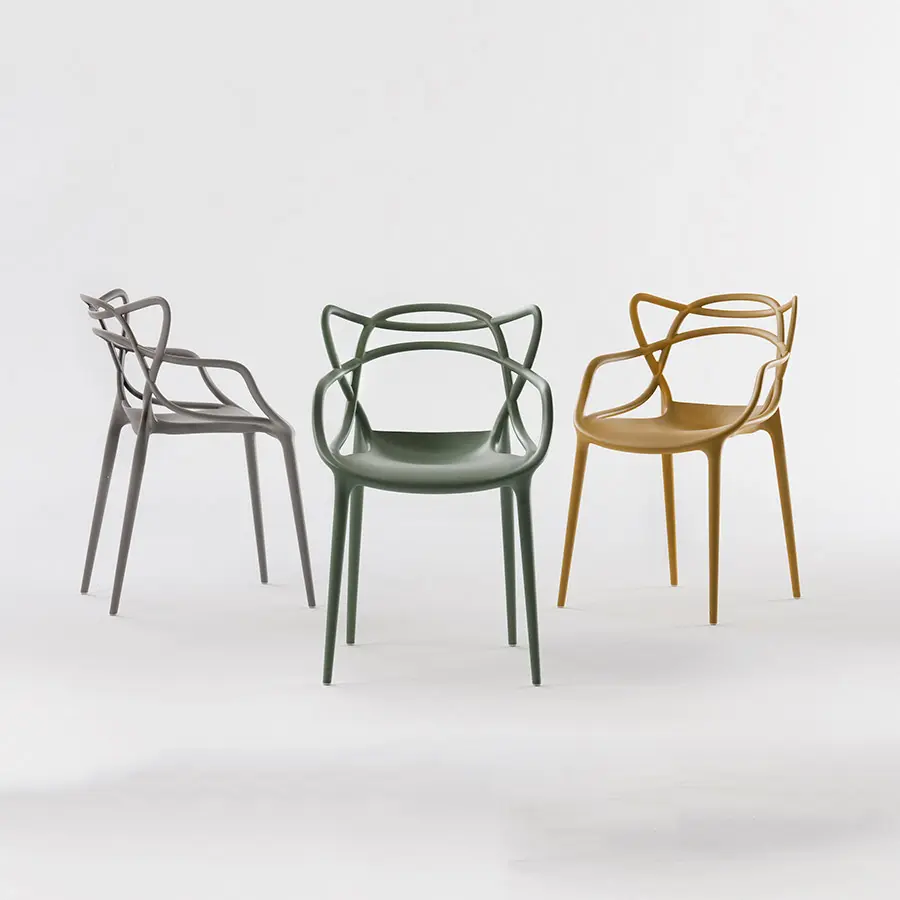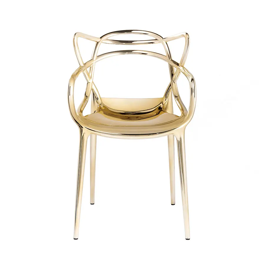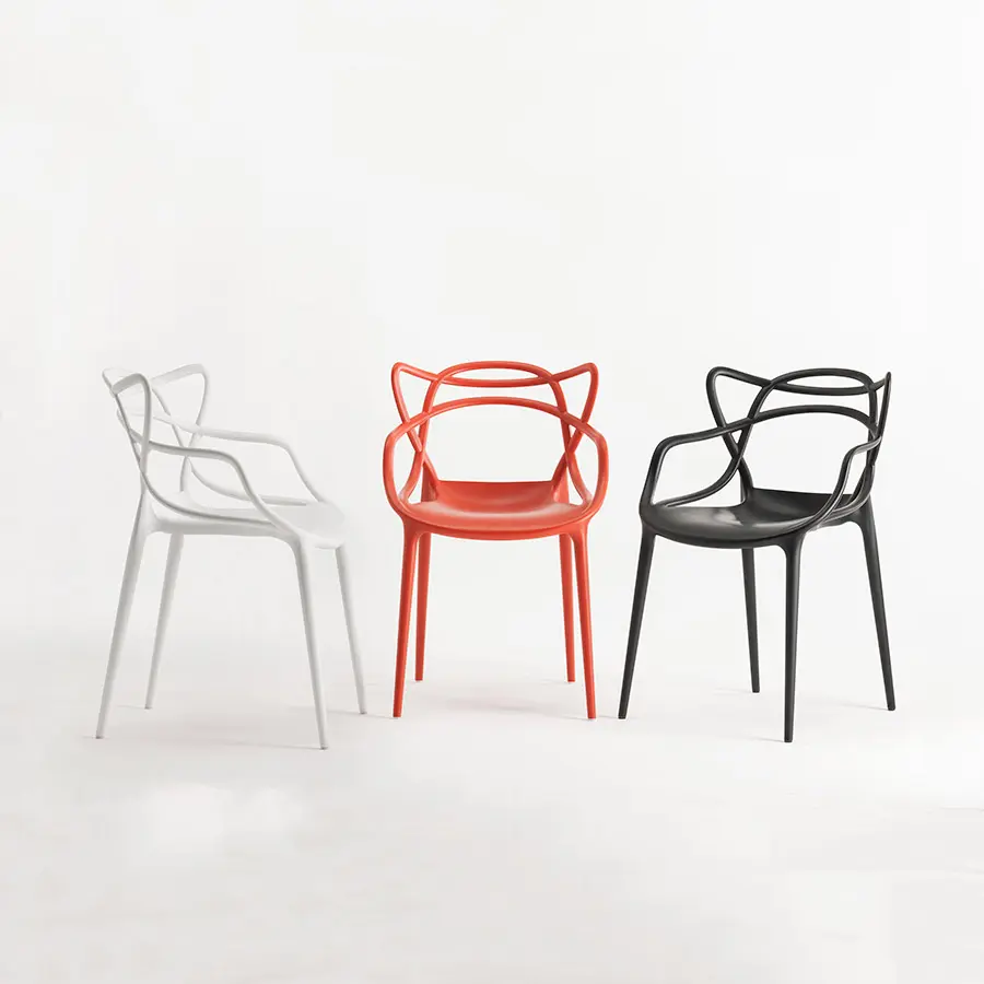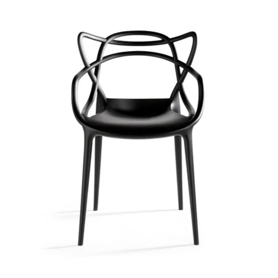 La silla Masters es un inteligente homenaje a tres sillas símbolo, releídas y reinterpretadas por el genio creativo Starck: la “Serie 7” de Arne Jacobsen, la “Tulip Armchair” de Eero Saarinen y la “Eiffel Chair” de Charles Eames, que entrelazan las inconfundibles siluetas en una silla híbrida y sinuosa para dar vida a una fusión de estilos original y atractiva. Apoyado sobre cuatro finas patas, el asiento de Masters es amplio y cómodo. El acabado particular de la silla la convierte en sensualmente aterciopelada. La auténtica nota distintiva de la silla es lógicamente su respaldo, que se caracteriza por las superficies macizas y los huecos creados por el entrelazado curvilíneo de tres respaldos distintos que descienden para confluir en el perímetro del asiento. Ligera, práctica, apilable y disponible en numerosos colores, Masters se puede utilizar también en el exterior. La silla Masters ha sido condecorada con el prestigioso premio “Good Design Award 2010” del Chicago Athenaeum – Museum of Architecture and Design.