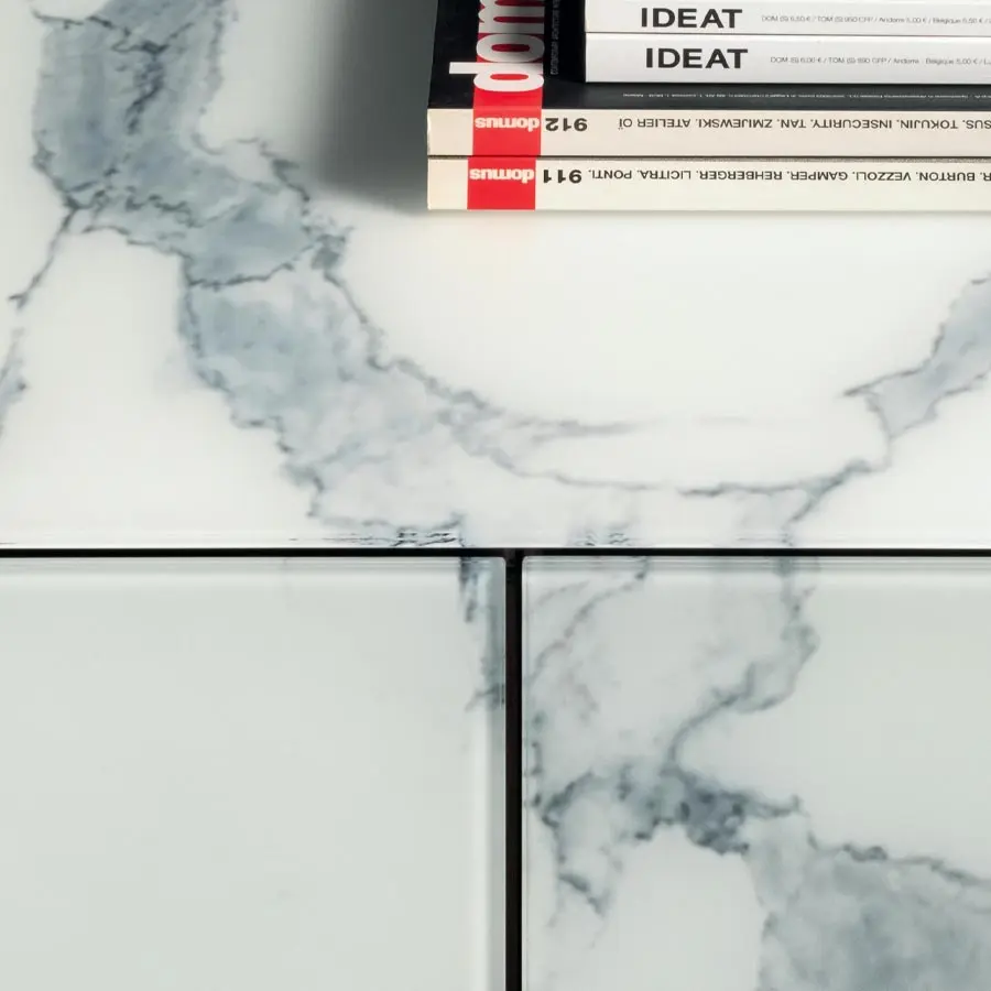 El aparador Materia de Lago destaca por su diseño limpio y contemporáneo, con volúmenes definidos por un cristal templado de 4 mm que aporta resistencia y una estética impecable. Disponible en versión suspendida o con apoyo al suelo sobre elegantes soportes metálicos, es una pieza que aporta sofisticación sin perder funcionalidad. Su sistema de acabados XGlass permite una personalización total con opciones que imitan vetas de mármol, texturas metálicas, madera natural o tejidos, en acabados mate o brillo, logrando una continuidad visual que realza la belleza de los materiales.