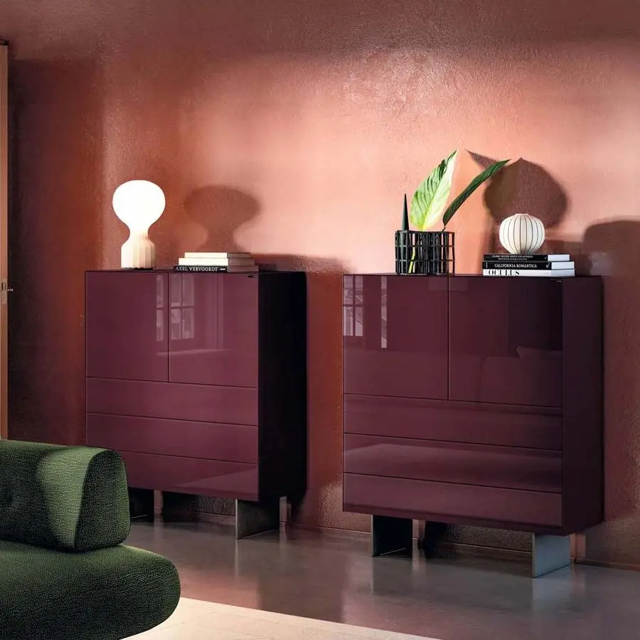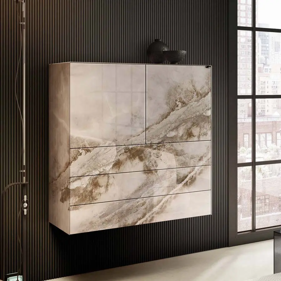 El aparador Materia se caracteriza por volúmenes lineales y puros dibujados por un cristal de 4 mm extremadamente resistente, que regala perfección a la superficie y la llena de emociones. Esta solución, suspendida o con apoyo al suelo sobre elegantes soportes metálicos, es infinitamente personalizable gracias a los diferentes acabados de mármol, metal, madera y tejido XGlass, que con su continuidad de vetas y patrones permite apreciar las propiedades de materiales naturales en acabados brillo o mate.