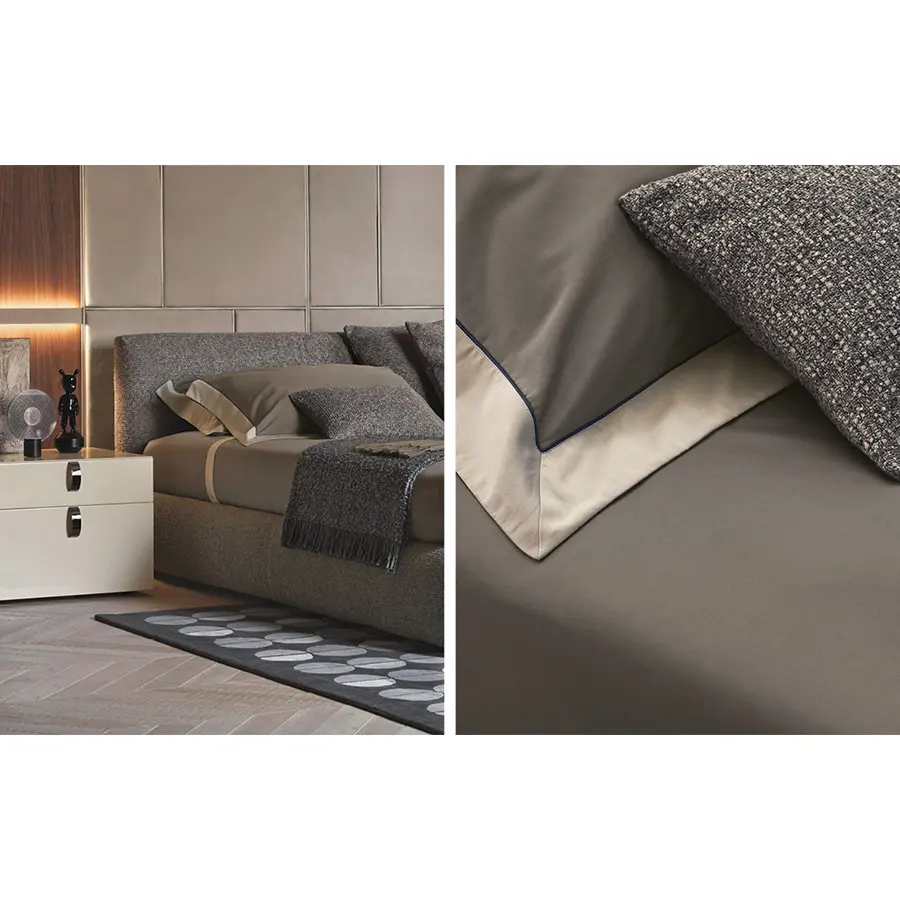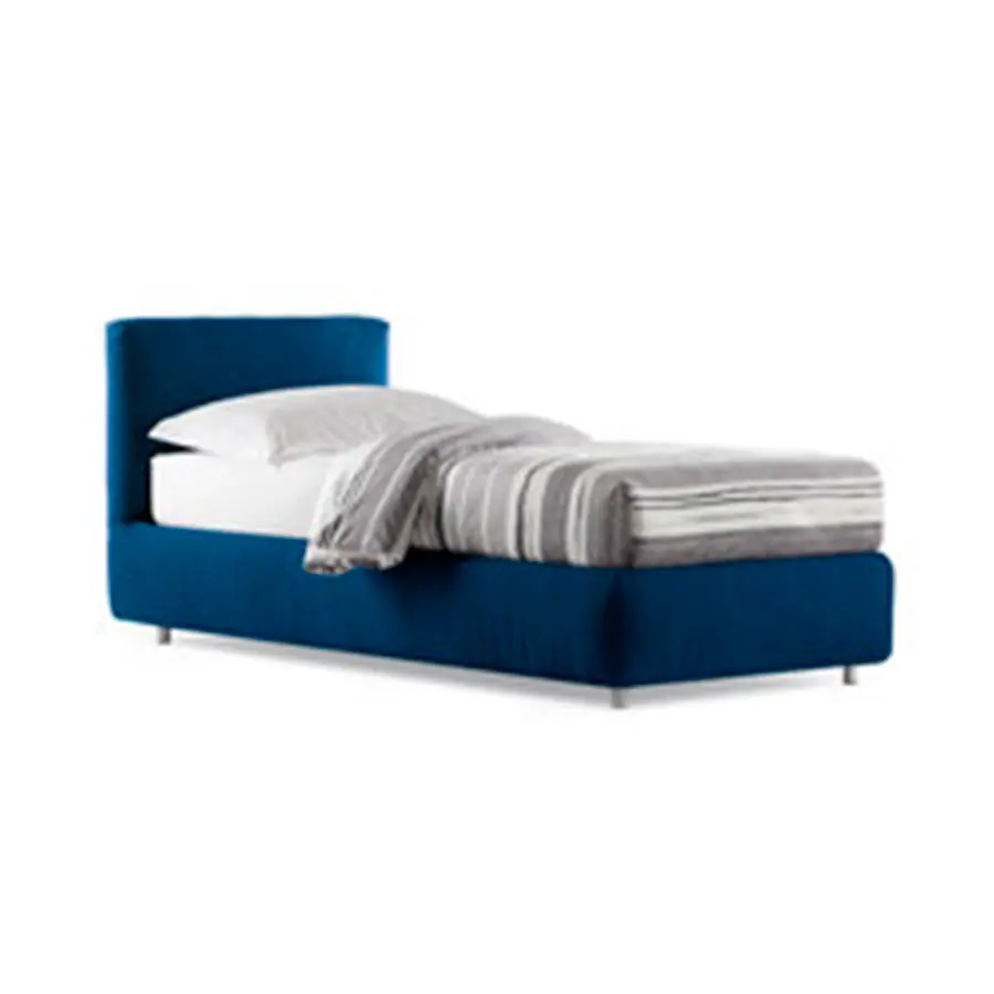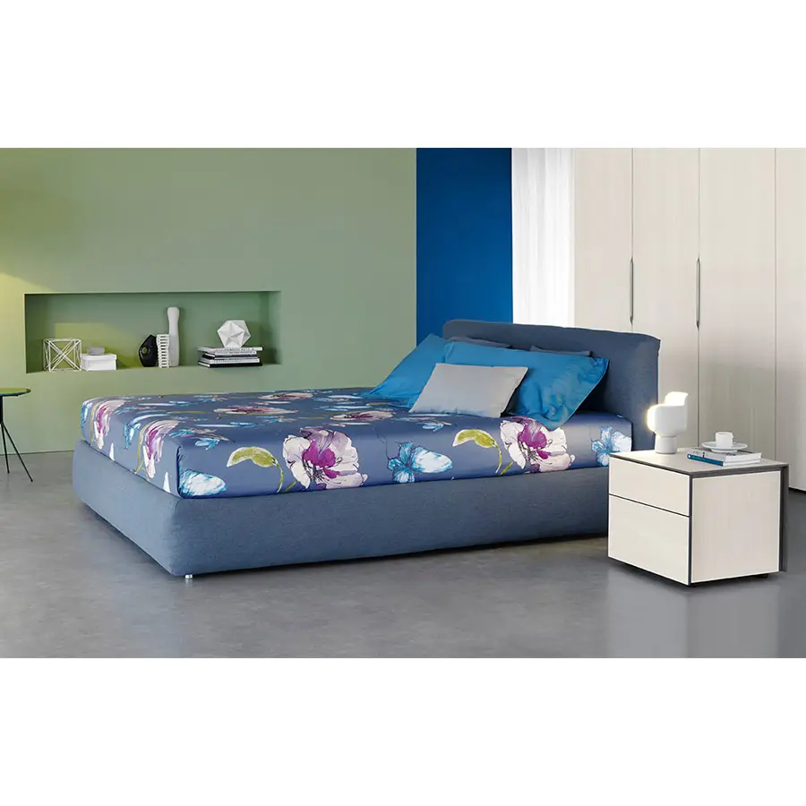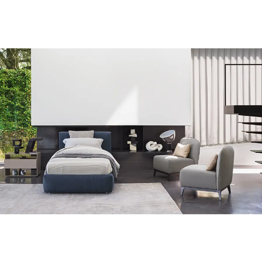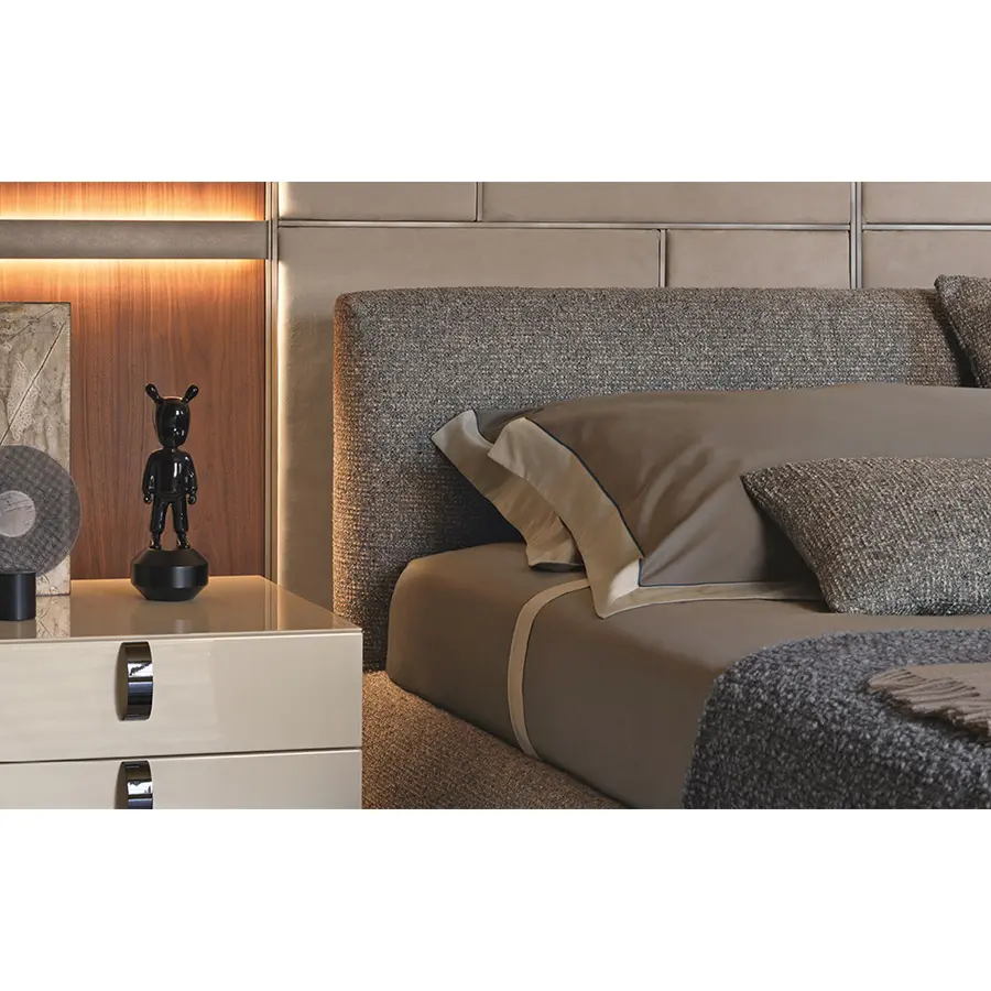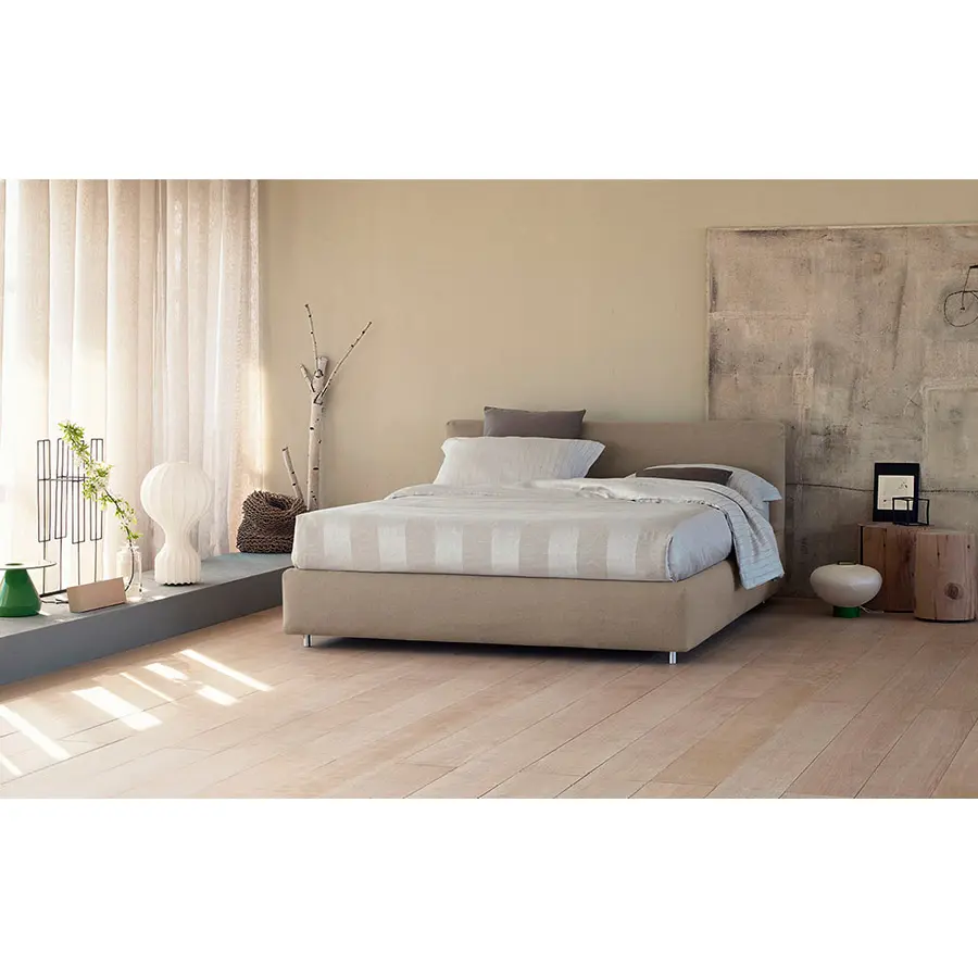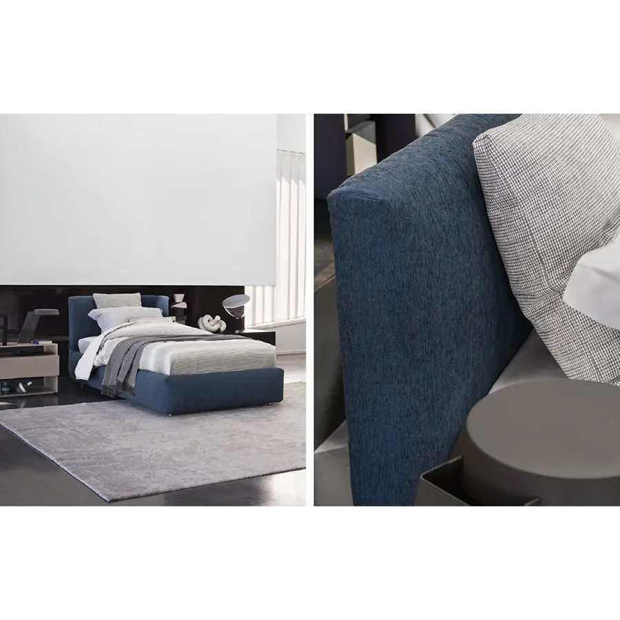 Con la base y la cabecera completamente y suavemente acolchadas, nace esta cama bajo el amparo de la tradición, de la artesanía y de la sobriedad. Disponible con base de muelles Leonardo, base fija h 25 cm, base contenedor, y con somieres con movimiento eléctrico. El revestimiento – combinado con un acolchado que acentúa su blandura – se puede elegir entre los tejidos,las pieles y la Ecopelle de la colección Flou, todos igualmente desenfundables.