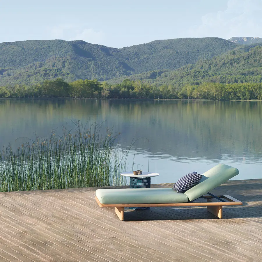 La colección Mesh de Patricia Urquiola combina materiales naturales e industriales, superficies duras y blandas, y volúmenes transpa­rentes y opacos. La sólida base de madera del sofá y la voluminosa y confortable tapicería evocan la sensación de una acogedora sala de estar trasladada al exterior. Esta tumbona está fabricada con marco de madera de teca natural, estructura metálica de aluminio pintado y cojines tapizados, disponibles en una gran variedad de colores.