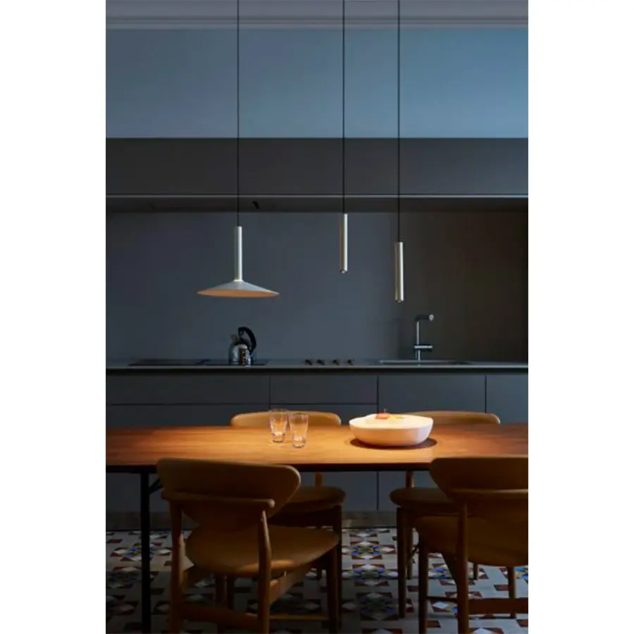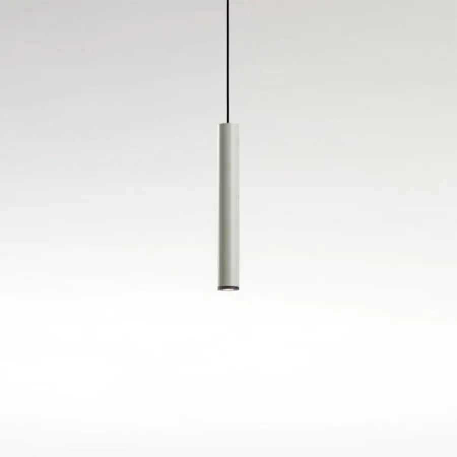 Paradójicamente este nuevo diseño empieza con la deconstrucción del arquetipo de una lámpara: sintetizándola al máximo, se queda solo con un cuerpo cilíndrico suspendido con un LED incorporado.