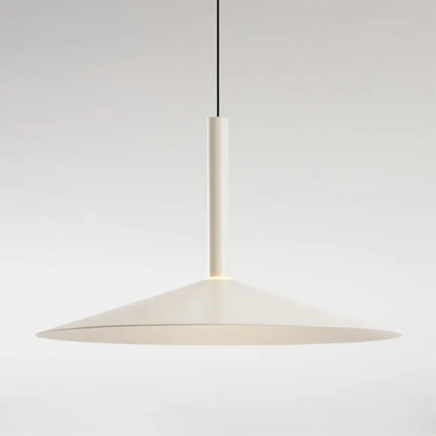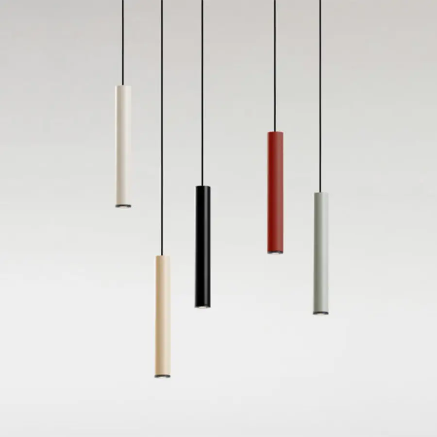 A este cilindro se le pueden añadir distintas pantallas cónicas en blanco perla, negro, beige, gris y rojo, y en varias medidas. Pero lo más ingenioso es que cada una de estas lámparas puede llevar un simple contrapeso que permite que, al colgarlas entre dos puntos, se puedan mover. Estructura tubular y pantalla en aluminio lacado con difusor de policarbonato translúcido. Cuerda con contrapeso que permite mover la lámpara a lo largo del espacio.