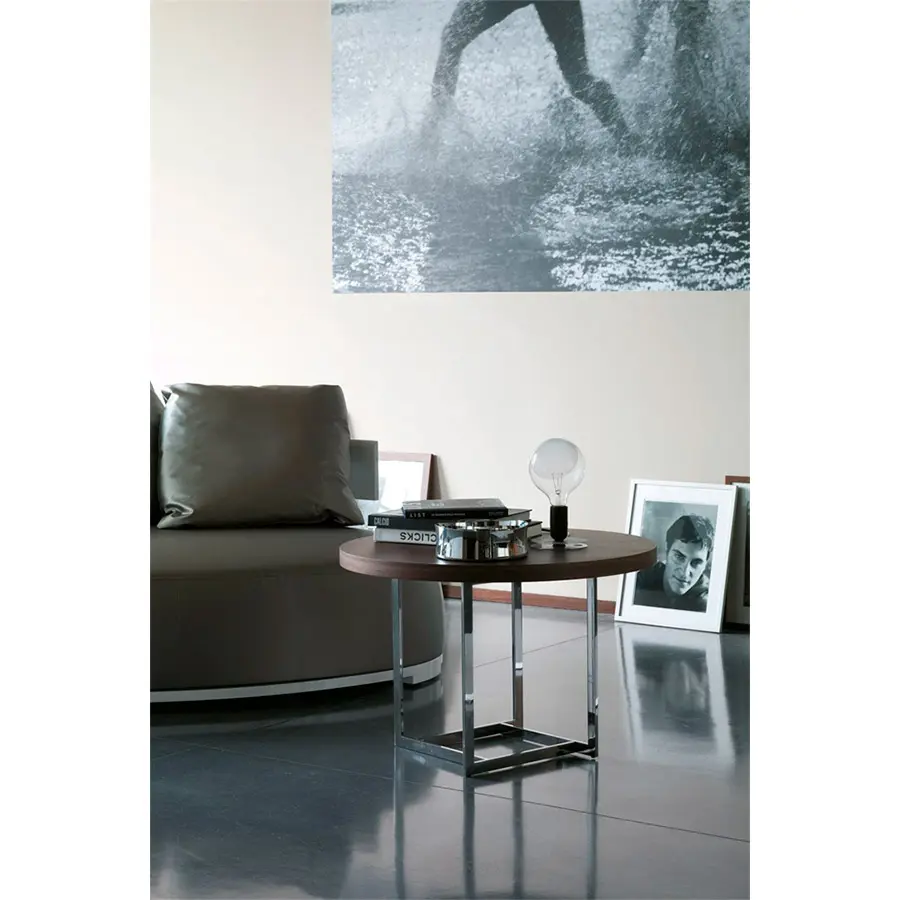 Serie de mesas de centro y auxiliares con tapa gruesa en nogal canaletta o fresno y estructura en metal. La tapa puede ser nogal canaletto – nogal canaletto teñido – fresno lacado en diferentes colores – La estructura metal puede ser cromada o antracita cepillado.