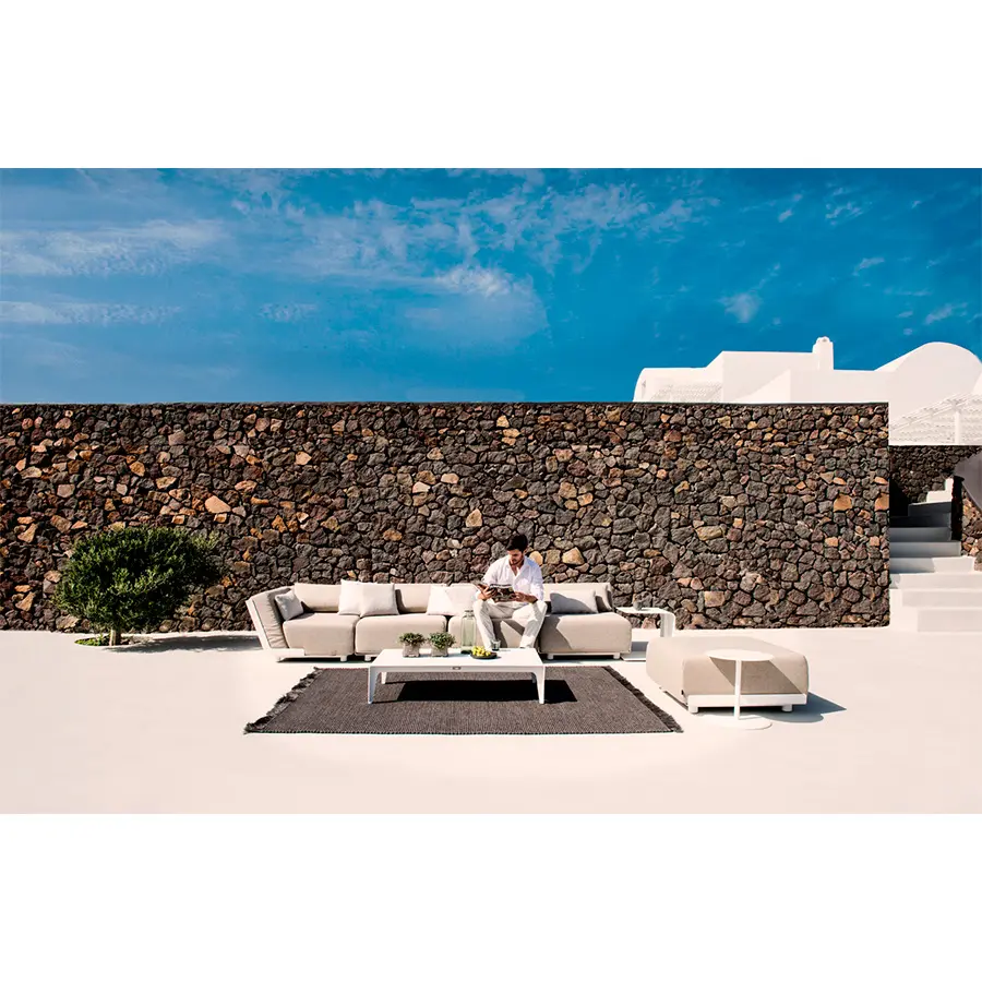 La mesa de centro Mirthe es de aluminio, un material que ideal para estar en el exterior; es resistente, completamente reciclable y necesita poco mantenimiento. Los ángulos redondeados del tablero de la mesa aportan un look suave. Las patas se han soldado longitudinalmente, sin juntas, en un ángulo de 90 ° y se han integrado en el tablero de la mesa.