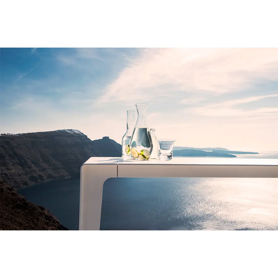 Minimalismo con un toque juguetón. La colección Mirthe reúne todos los elementos de un típico mueble de exterior de Tribù: líneas puras y limpias que no pasan de moda, con una imagen fresca y moderna. Las patas se han soldado longitudinalmente, sin juntas, en un ángulo de 90° y se han integrado en el tablero.
