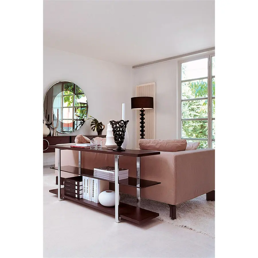 Consola en fresno y cristal templado con estructura en metal.