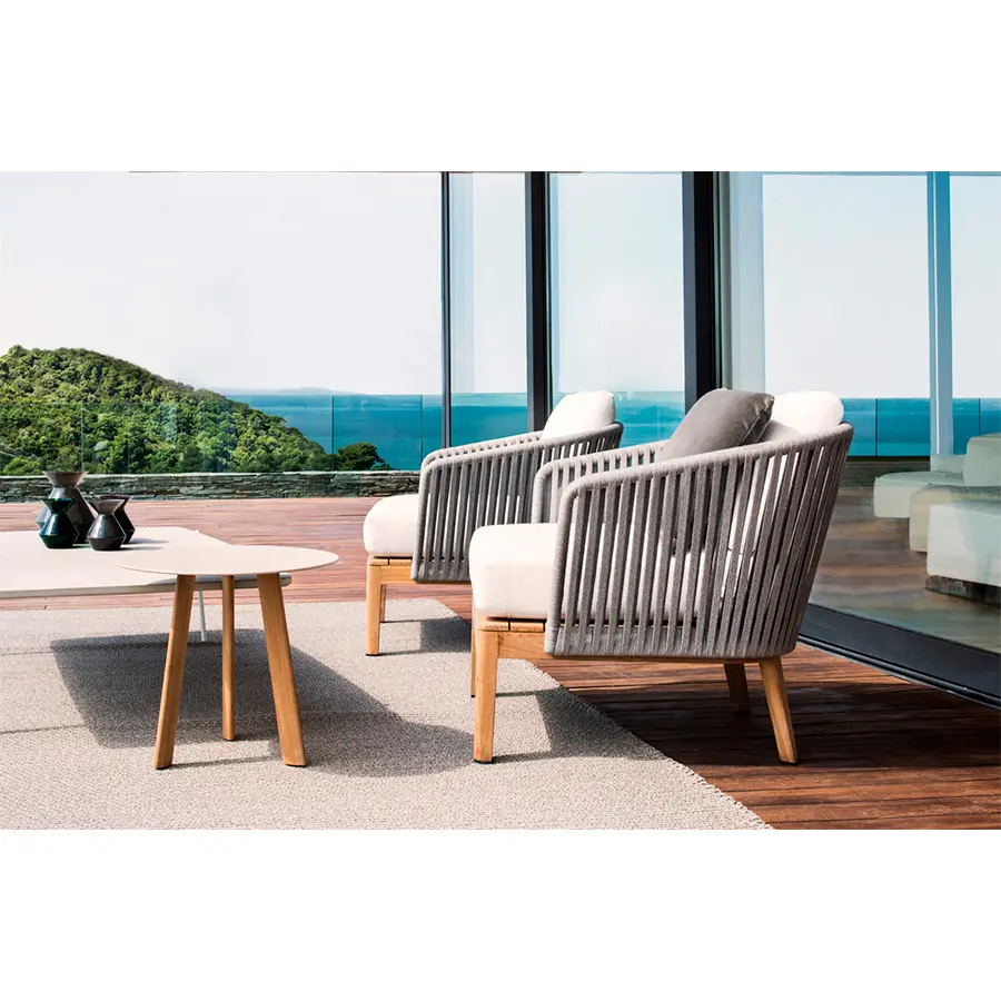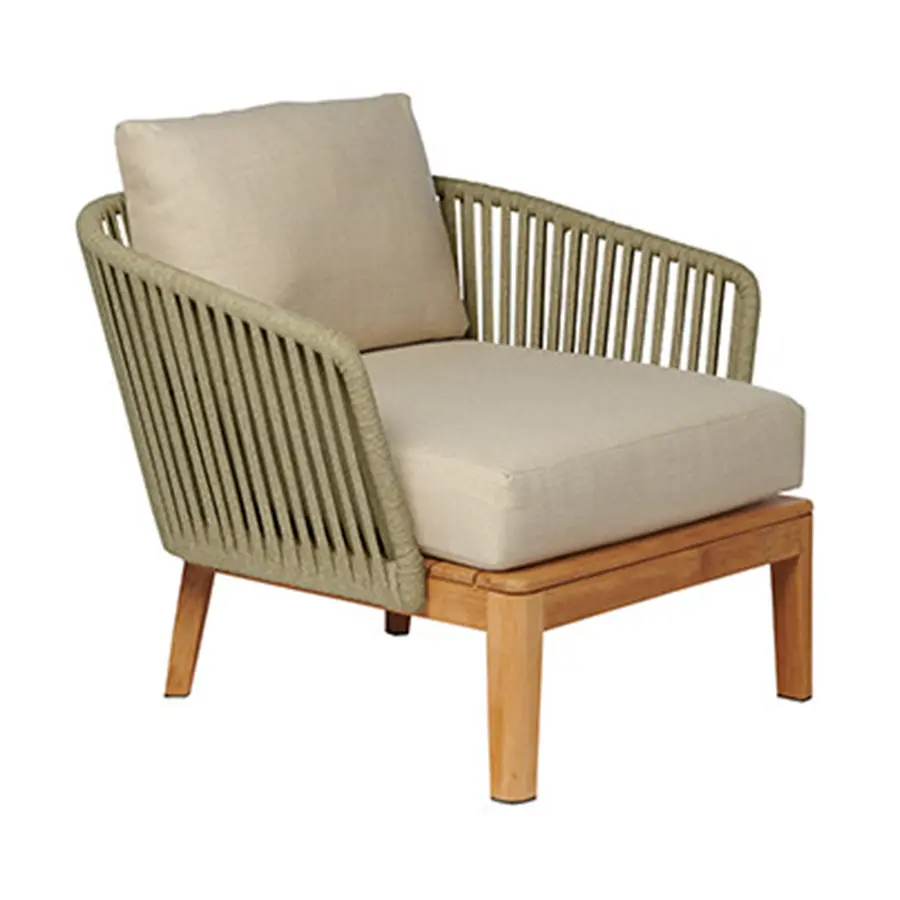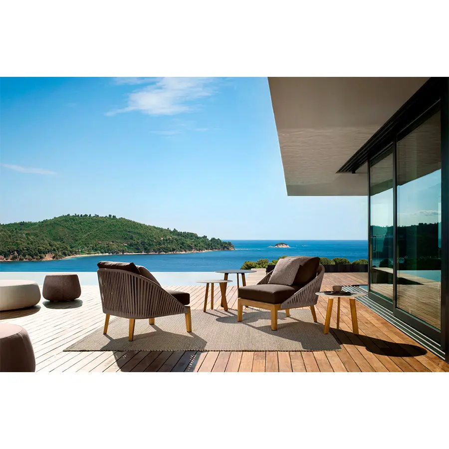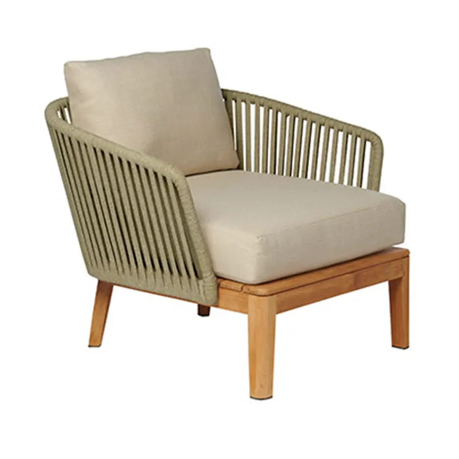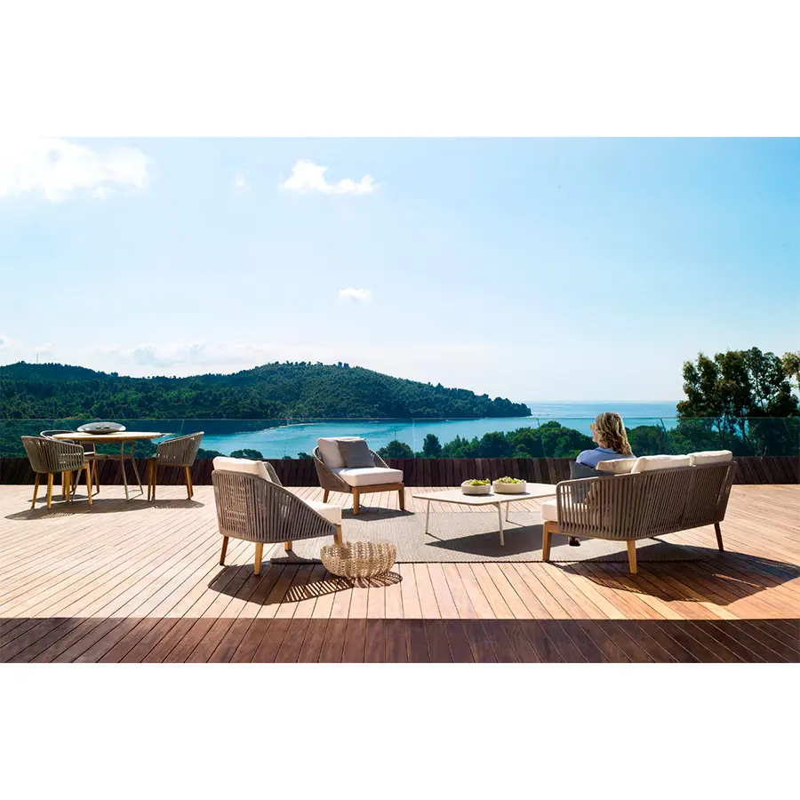 El vaporoso diseño de la colección Mood y la cálida combinación de teca y mimbre trenzado a mano, crea instantáneamente un ambiente especial en su terraza. El trenzado de color Moss, Linen, Wengé, Earthbrown o Stonegrey en Tricord está compuesto por poliolefina, una fibra ecológica y resistente a la intemperie que ofrece un aspecto y una sensación muy naturales. Ofrece un confort muy agradable gracias a los cómodos cojines de exterior.