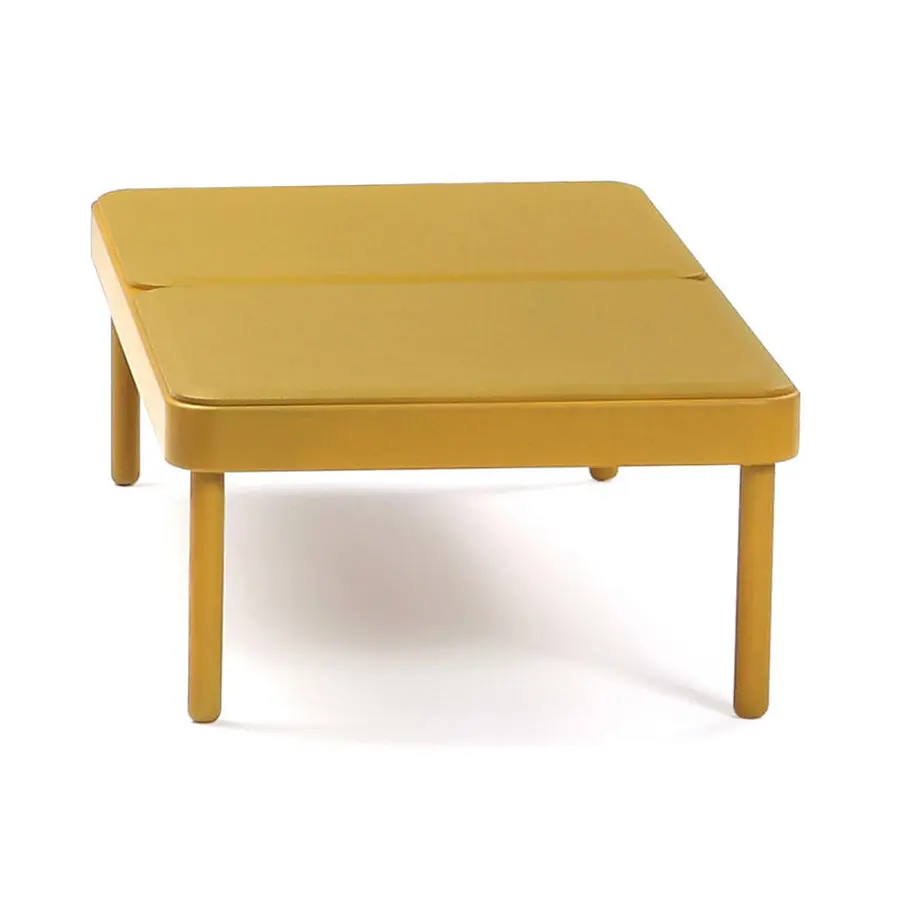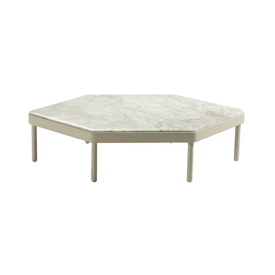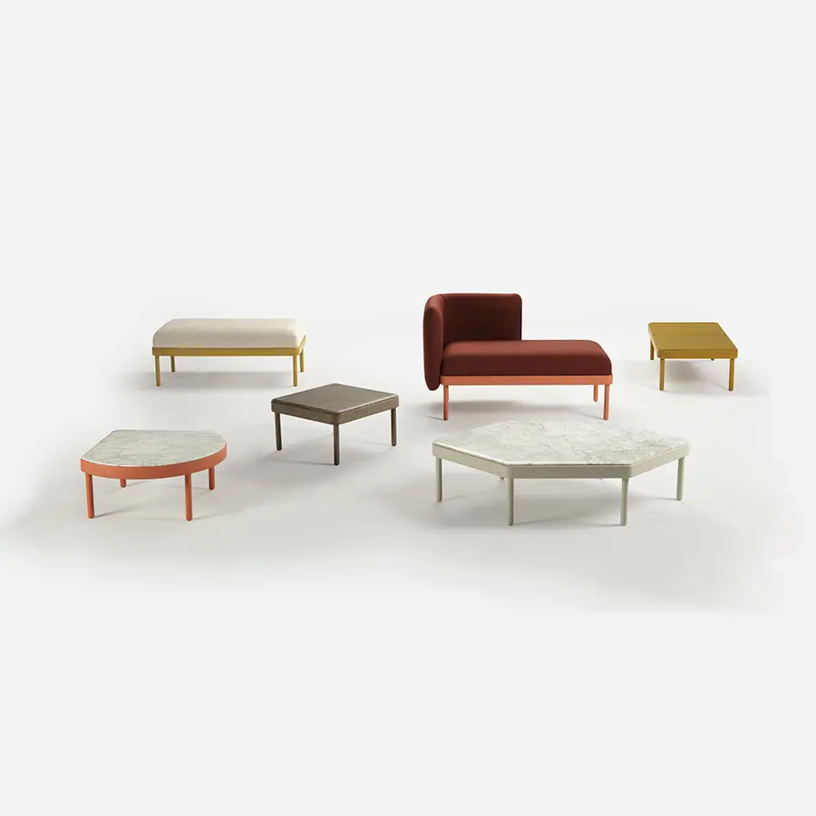 La pieza hexagonal permite, entre otras posibilidades, crear composiciones de 360º. La mesa ángulo aporta sinuosidad al diseño gracias a su lado curvo.