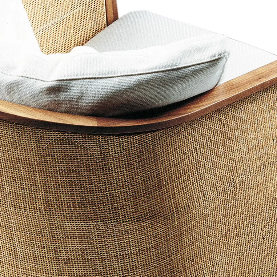 Mozart es un elegante sillón de interior con un encanto exterior y vagas reminiscencias de la época colonial. Su estructura ligera pero robusta en metal y madera –nogal americano y fresno en una variedad de colores– se distingue por el uso del junco trabajado en lienzo, lo que le confiere una gracia inusual. La comodidad está garantizada por el generoso acolchado: El cojín del asiento está hecho de poliuretano y dacrón, mientras que el cojín del respaldo puede ser dacrón o de plumón de ganso. Equipado con unas prácticas ruedas delanteras, el sillón Mozart se puede desplazar muy fácilmente.
