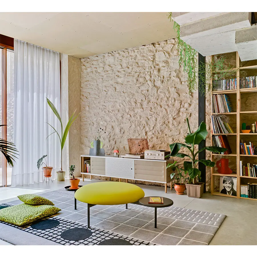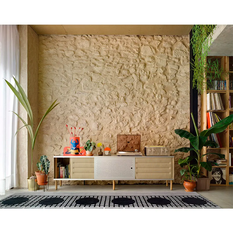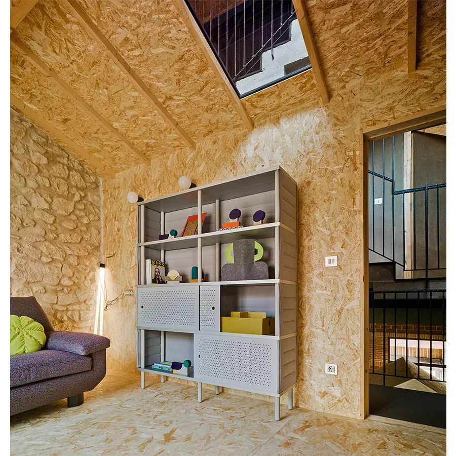 Los módulos y puertas tapizadas revisten los estantes e incorporan un diseño fono-absorbente, trascendiendo así la función decorativa.
