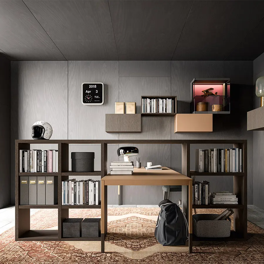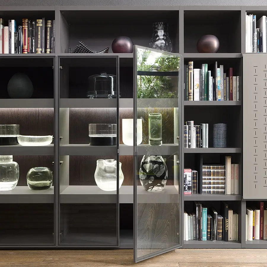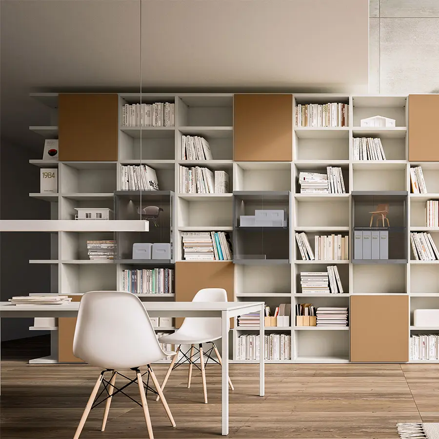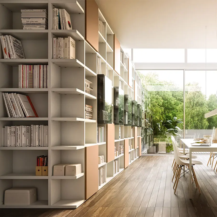Librerías de lateral portante con una excepcional versatilidad de espesores. El sistema se caracteriza por costados y baldas de 35 mm de espesor que subrayan su valor y robustez.