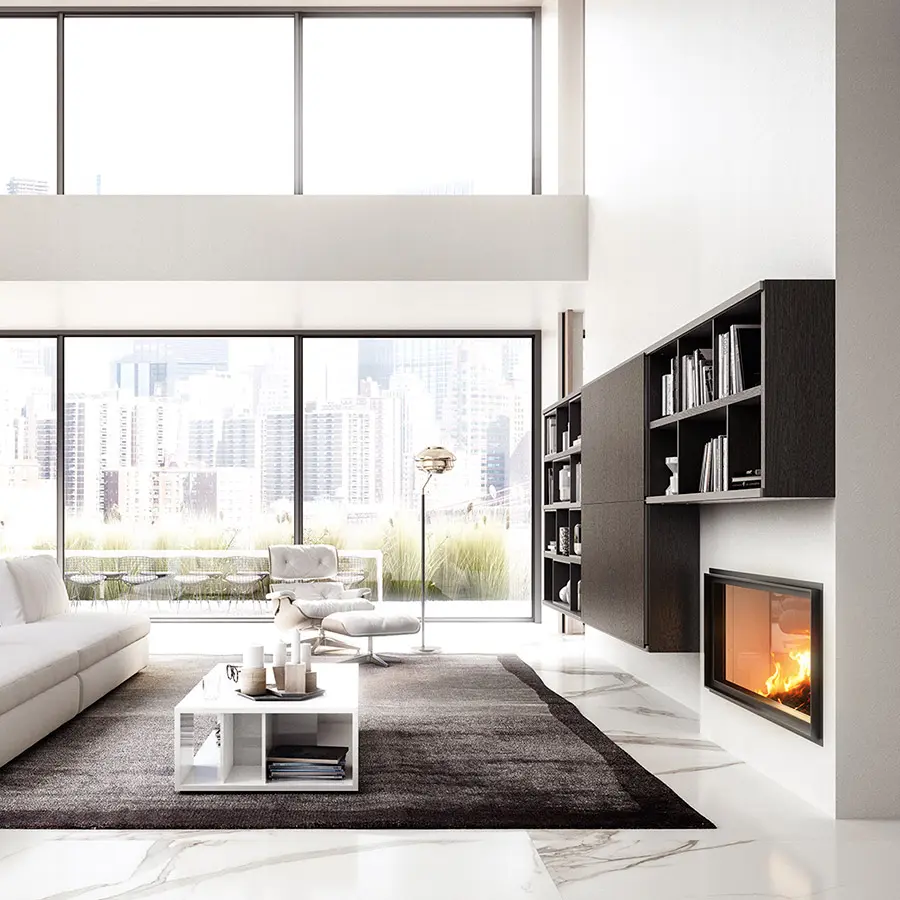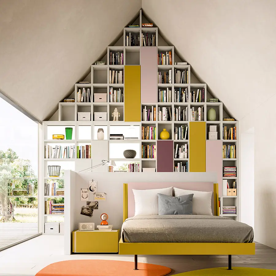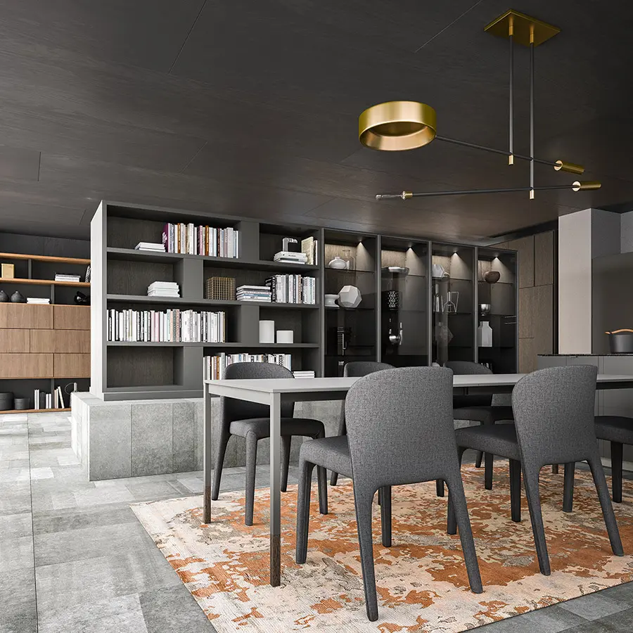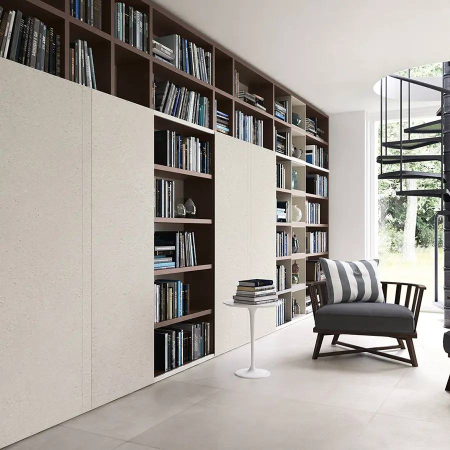 Librerías de lateral portante con una excepcional versatilidad de espesores. El sistema se caracteriza por costados y baldas de 35 mm de espesor que subrayan su valor y robustez.