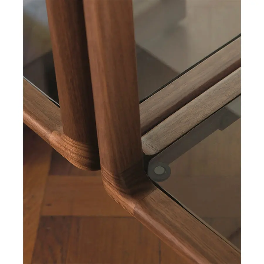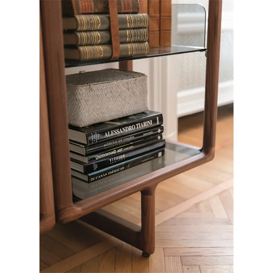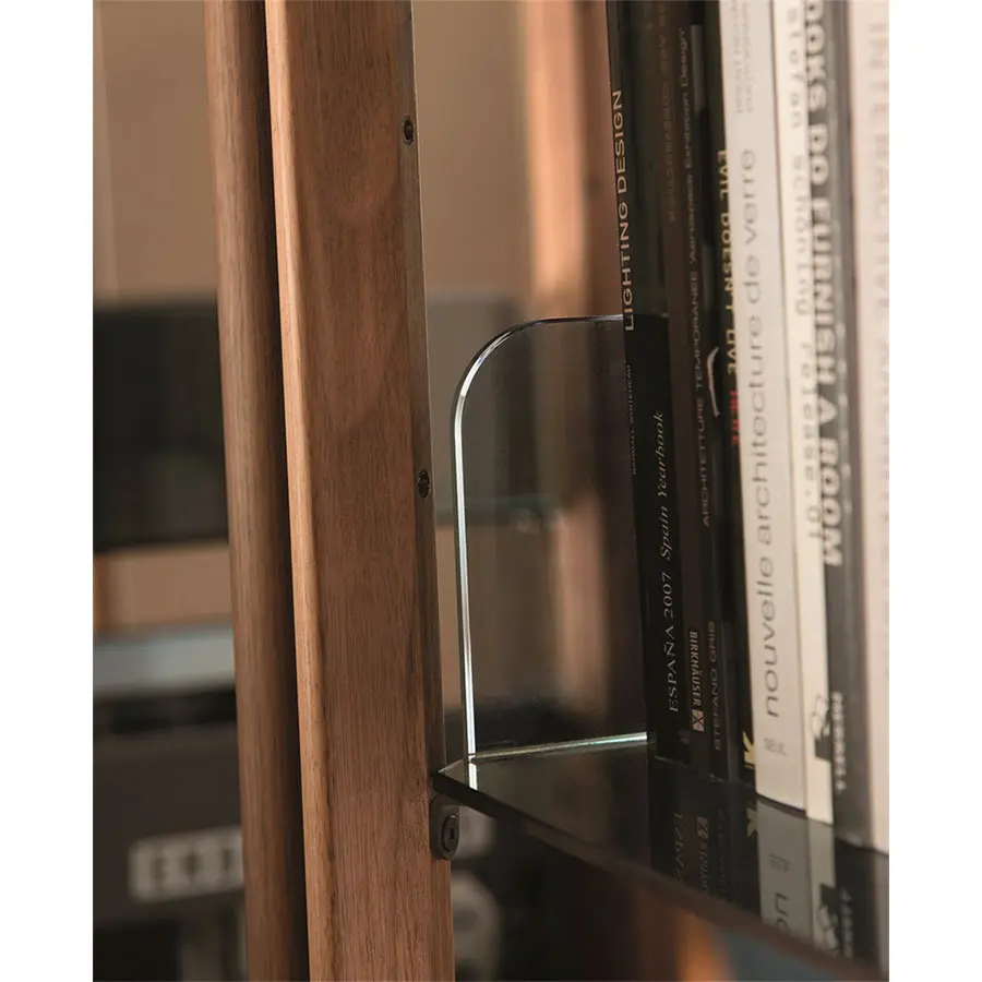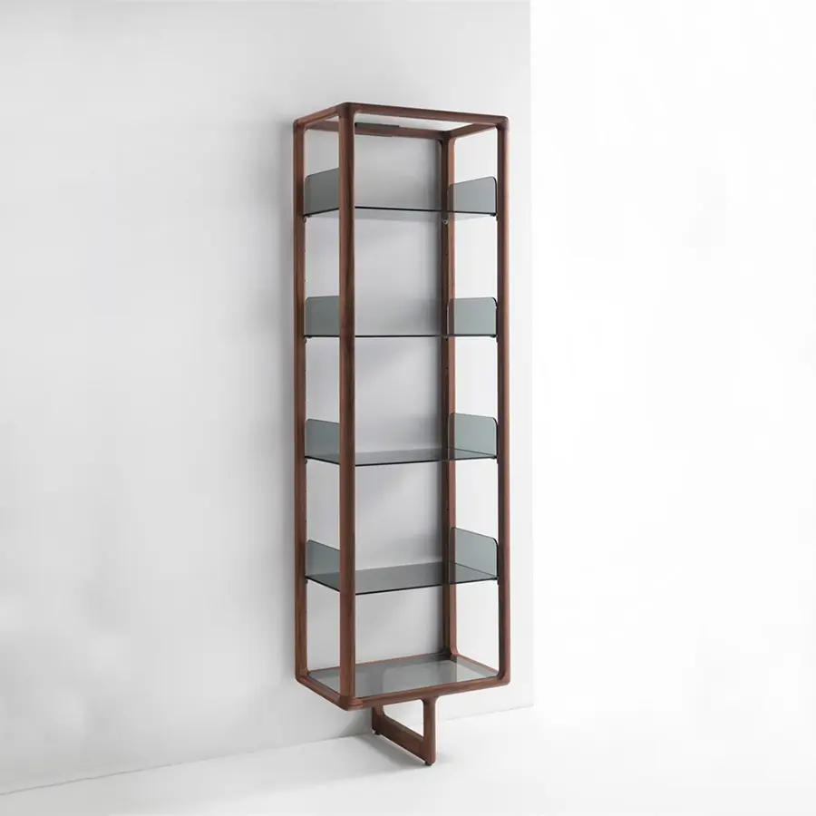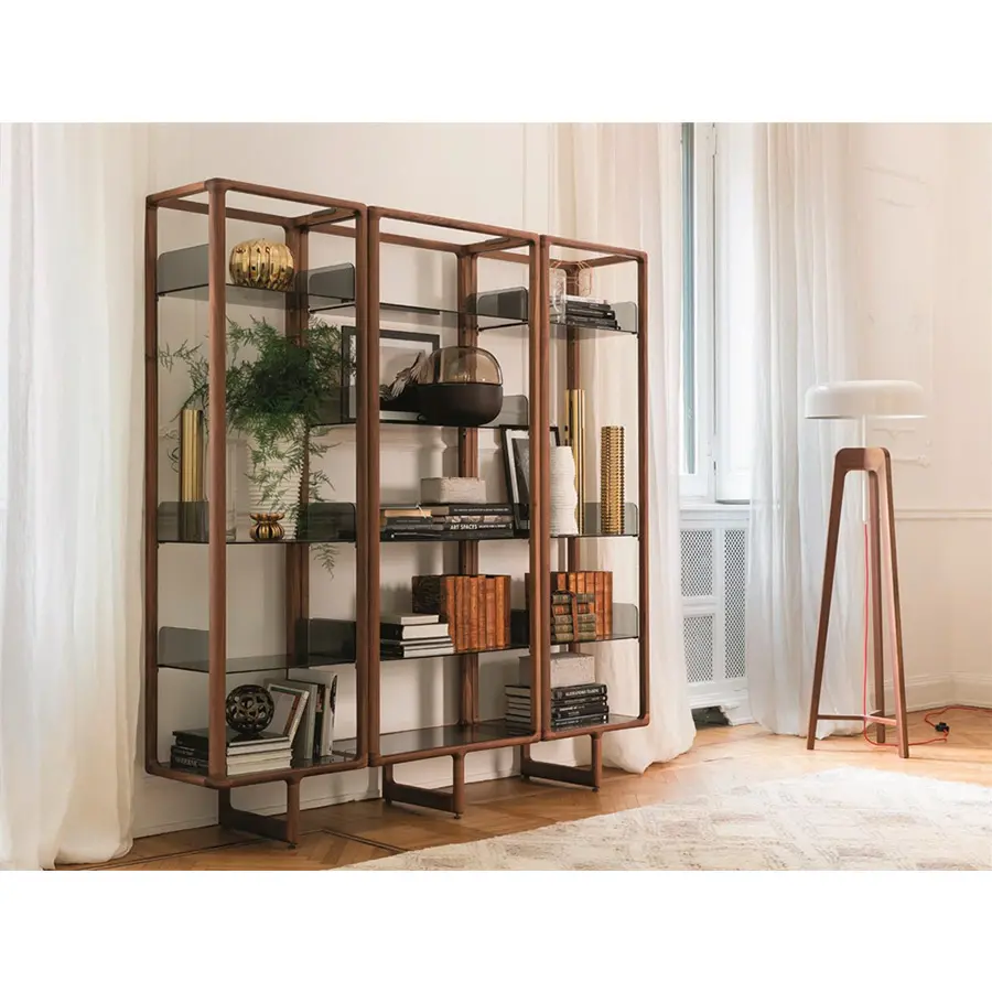 Estantería en nogal canaletta macizo con estantes en cristal templado ahumado. Si se utiliza sóla, se tiene que fijar la estructura a la pared, mientras que en composición se puede utilizar como separador de ambientes. Elementos de unión o fijados a pared en latón bronceado cepillado.