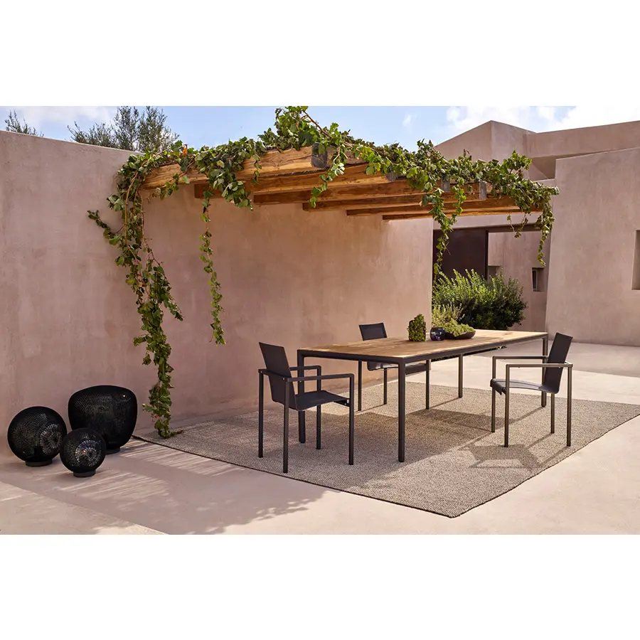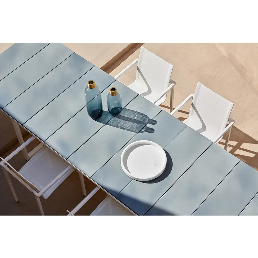 Un marco elegante y un asiento curvado que parece flotar. La colección Natal Alu combina la funcionalidad con una clase impecable y un fuerte carisma. Los apoyabrazos redondeados de las sillas aportan a este mueble de exterior un aire más femenino en comparación con el Natal Inox, la variante en acero inoxidable.