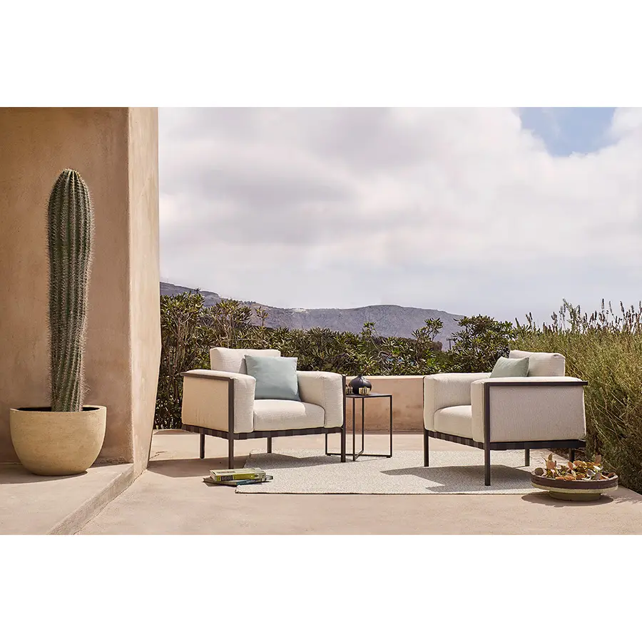 Los cojines tienen un relleno transpirable protegido por una funda de polipropileno laminado. Las costuras de esta funda también se han reforzado adicionalmente en el interior para garantizar que el agua no puede penetrar a través de las costuras. El marco de aluminio del sofá tiene una doble capa de recubrimiento de polvo, con una laca ultraduradera que ofrece una óptima resistencia a los arañazos.