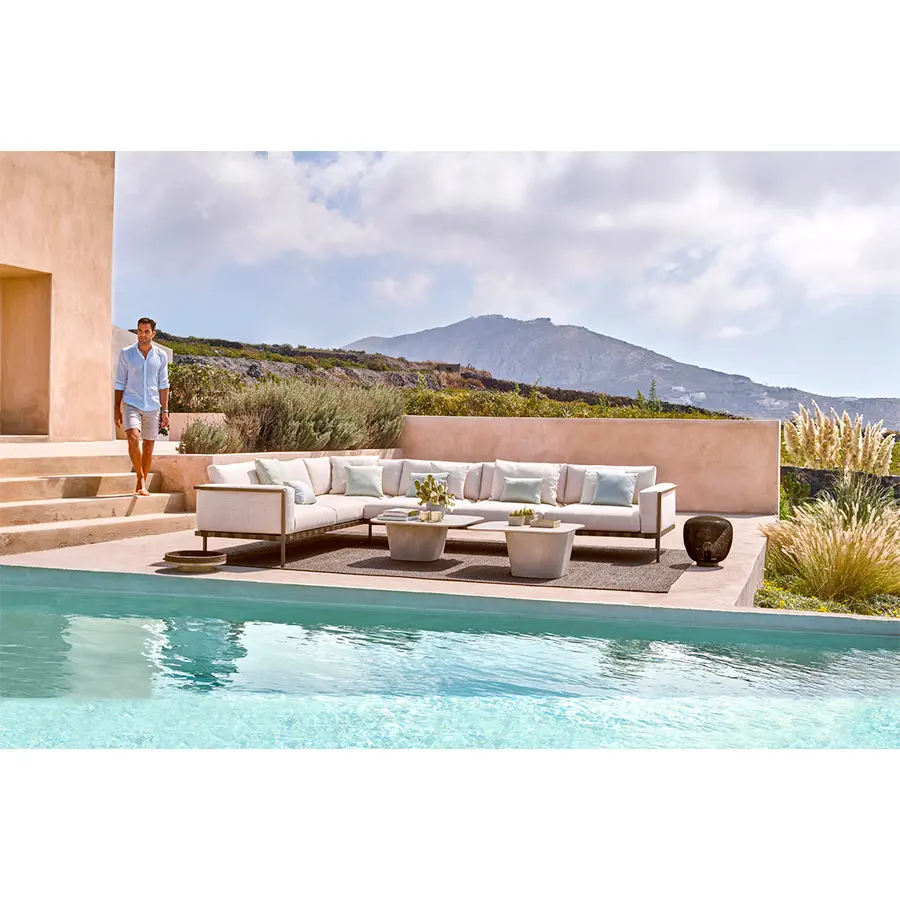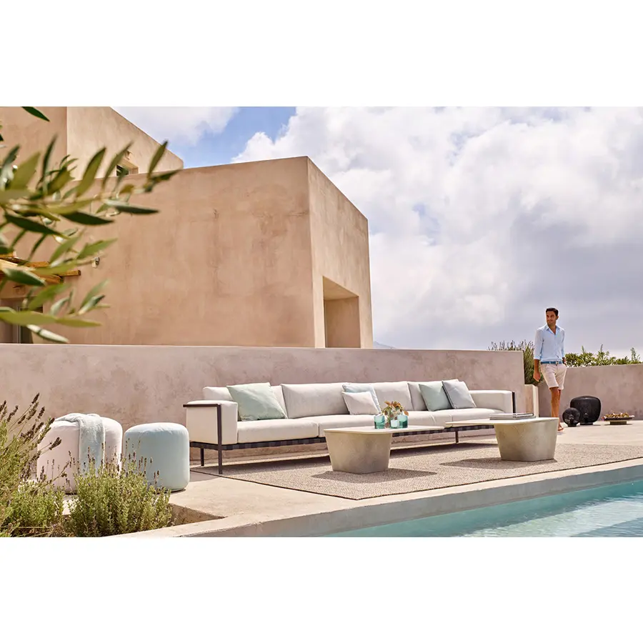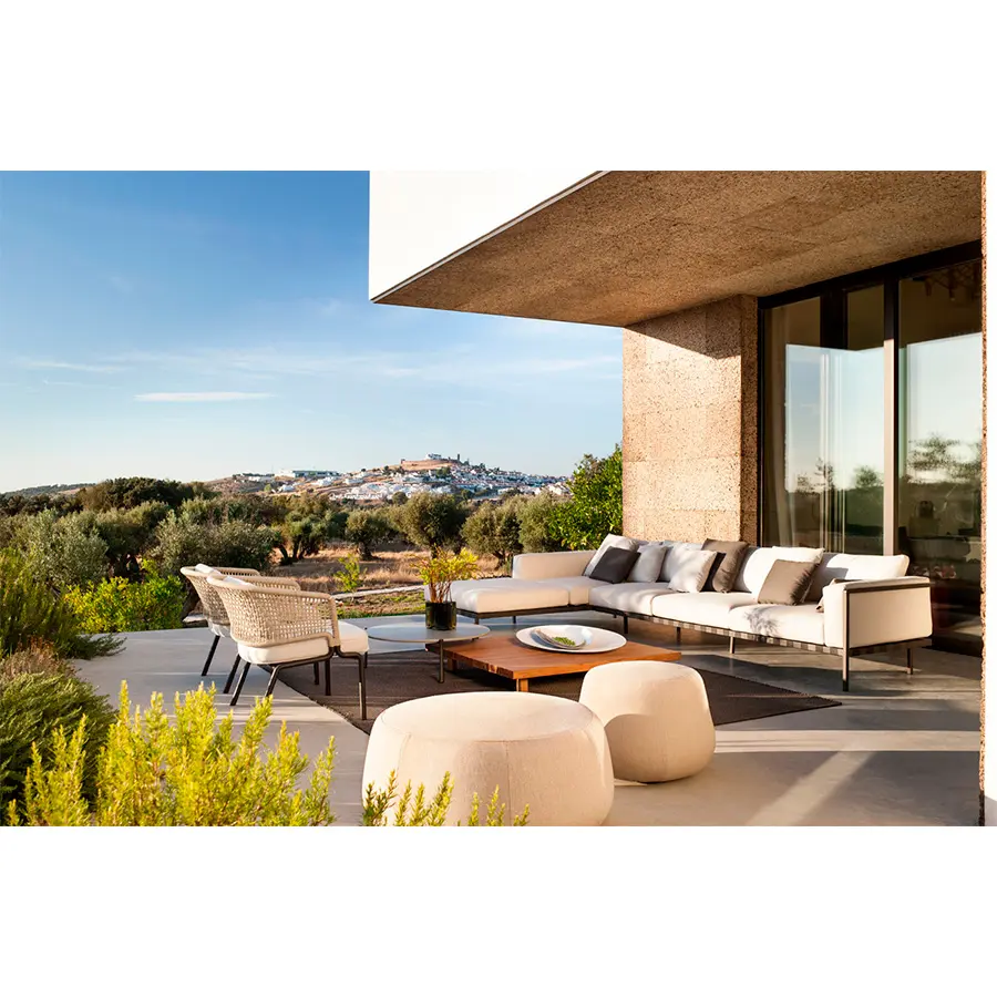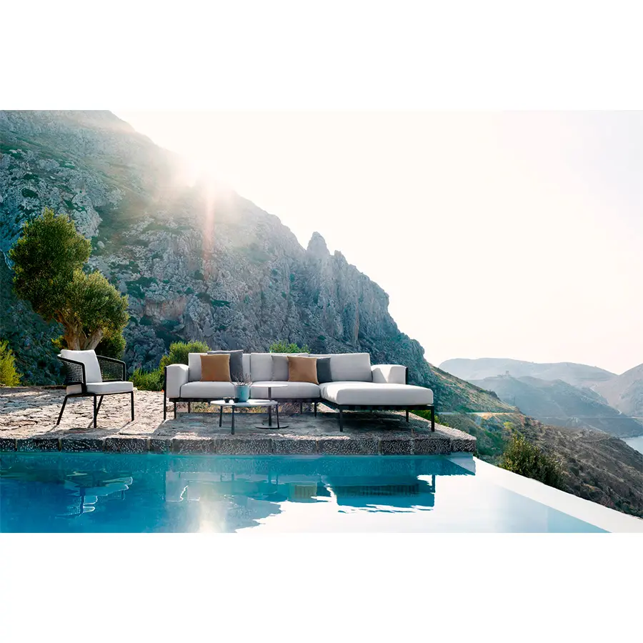 Si a esto le añadimos los dos colores de la estructura y los más de 100 tejidos de exterior disponibles para los cojines, las posibilidades son infinitas. Prestamos especial atención a los cojines de exterior, que se pueden dejar fuera durante toda la temporada de aire libre y que cuentan con un tejido de anchas tiras de textileno.