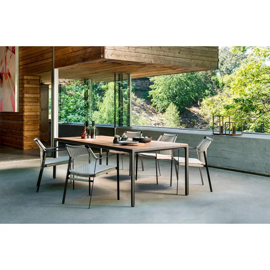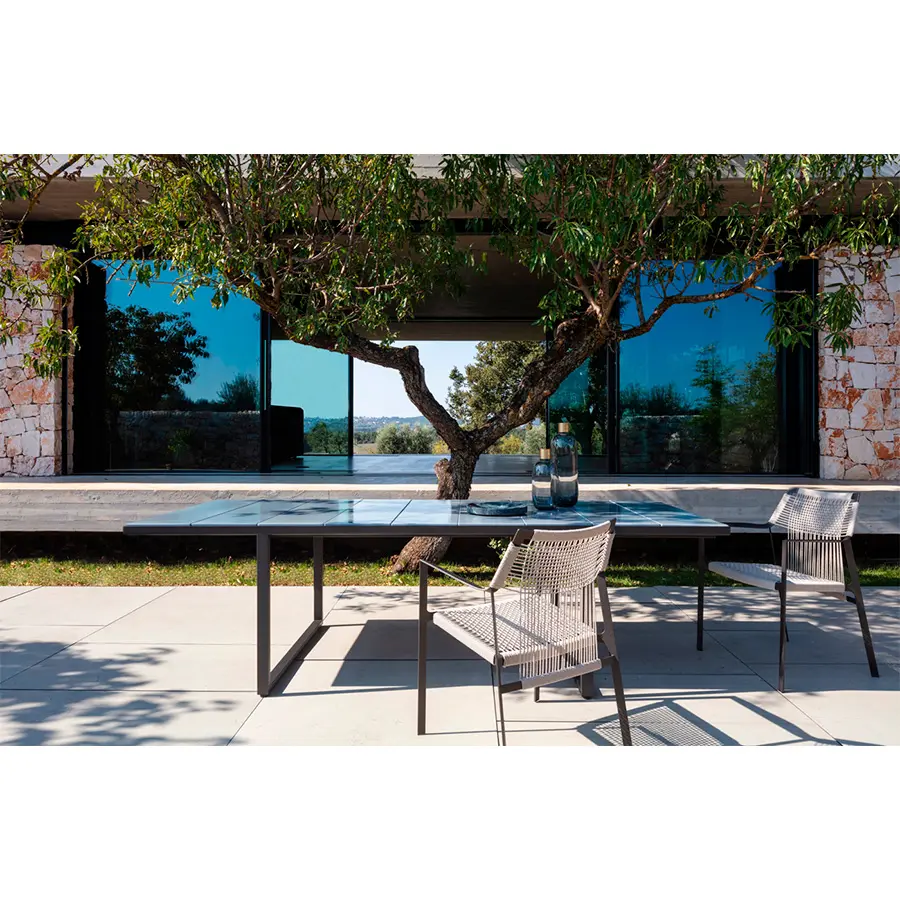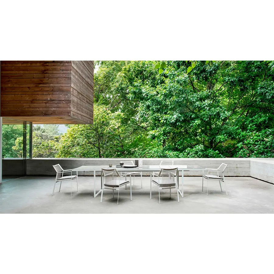 La ligera silueta de la silla Nodi se caracteriza por la cuerda retorcida de Canax®, resistente a la intemperie, que se extiende geométricamente sobre un fino y escultural bastidor de acero inoxidable con recubrimiento de polvo. Sus proporciones refinadas y el enfoque minimalista de los materiales confieren una ligereza informal a la colección.