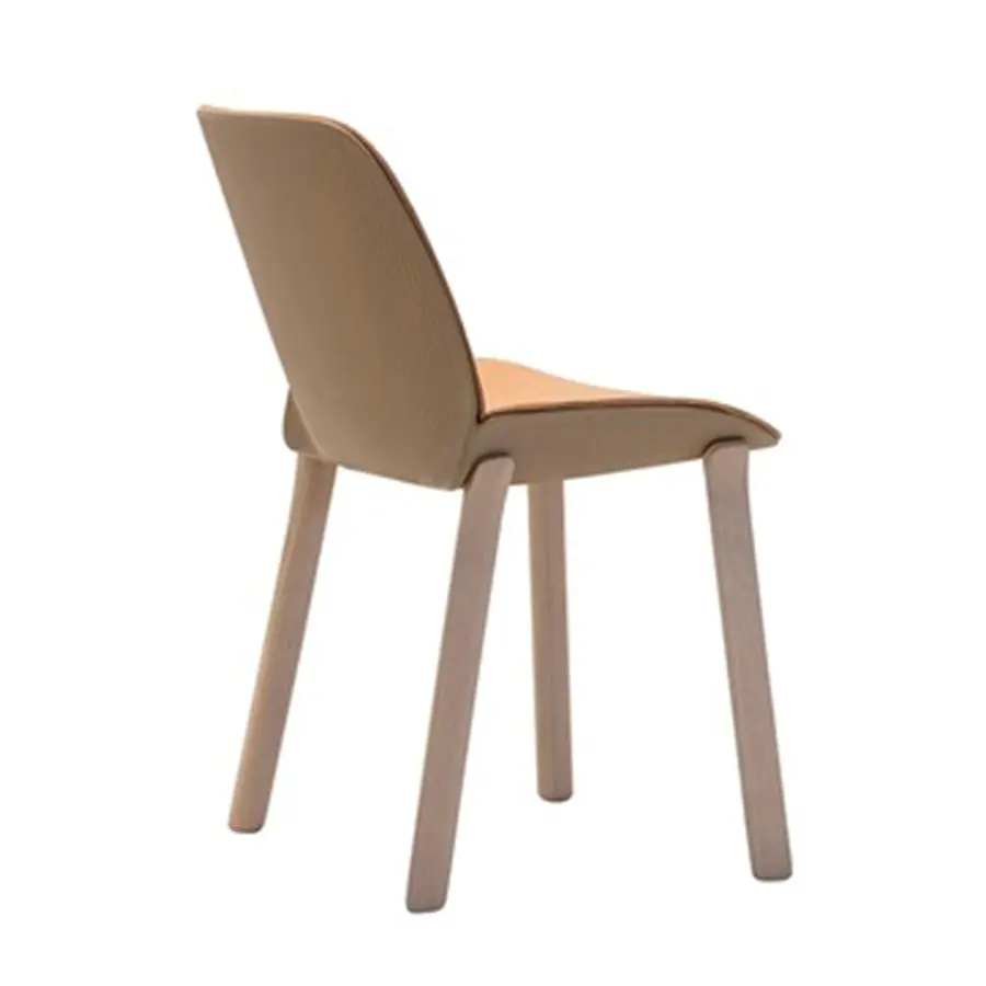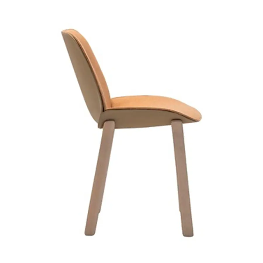 Silla con asiento y respaldo termopoliméricos disponibles en varios colores y base de madera maciza de fresno de 4 patas. Asiento tapizado opcional o almohadilla de concha.