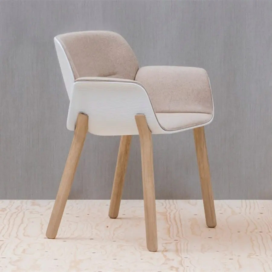 Sillón con carcasa de Termopolímero disponible en varios colores y base de 4 patas de madera maciza de roble.
