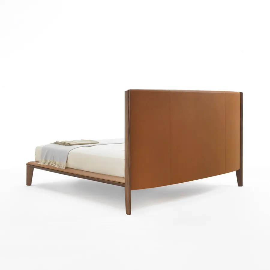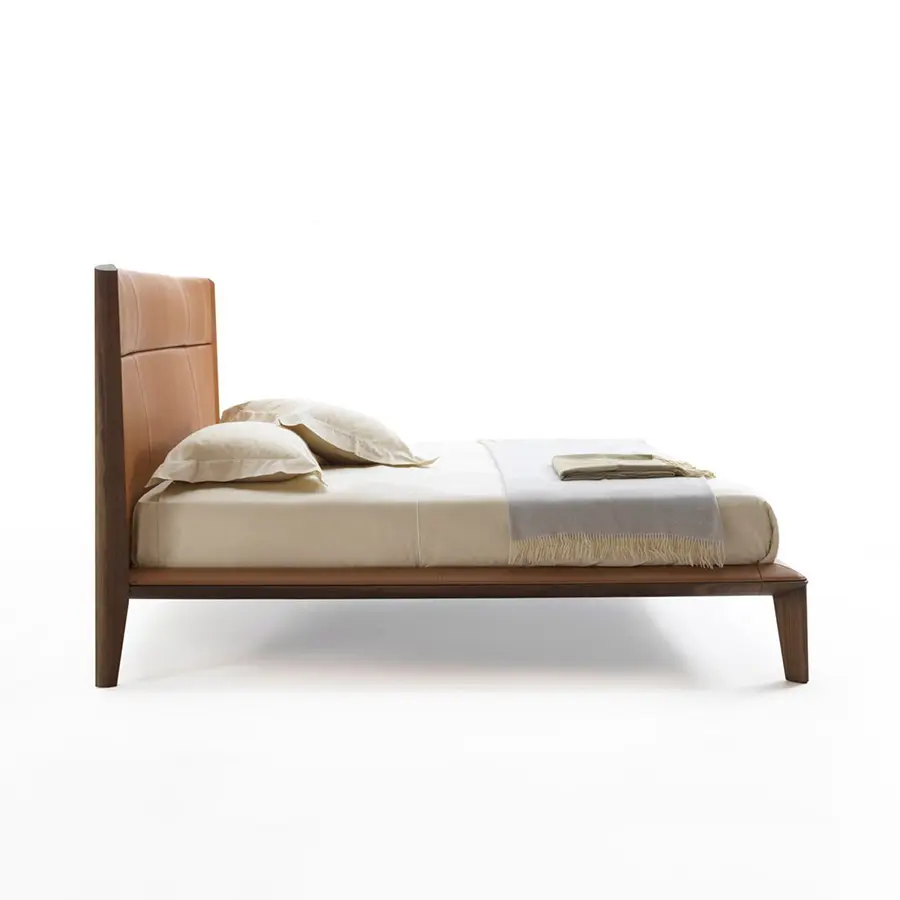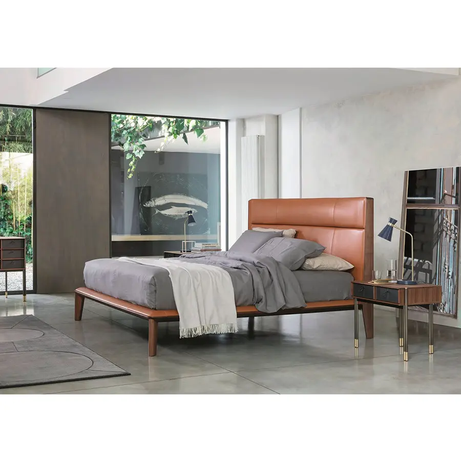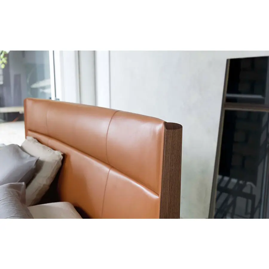 Cama con estructura realizada totalmente en nogal canaletta macizo. Aro en contrachapado de álamo revestido de cuero o de cuoietto. Cabecera revestida de cuero o de cuoietto con estructura de soporte en contrachapado de álamo y relleno de poliuretano moldeado.