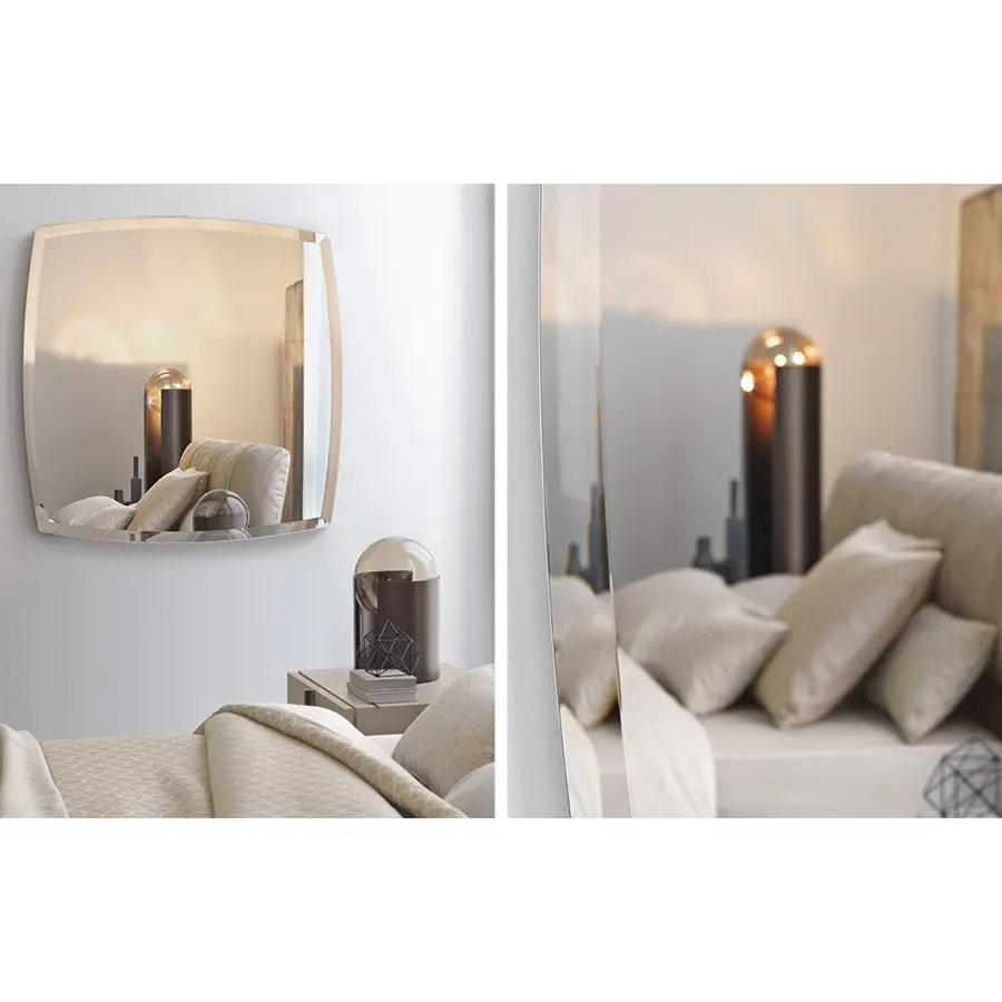 Serie de espejos disponibles en tres medidas diferentes, realizados en cristal biselado con marco de 4,5 cm, con acabado natural y ahumado. Disponible también en la versión con LED.