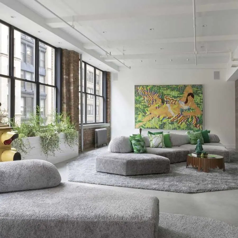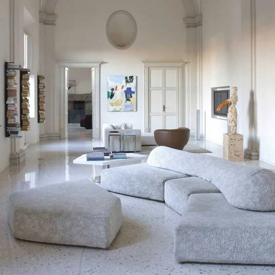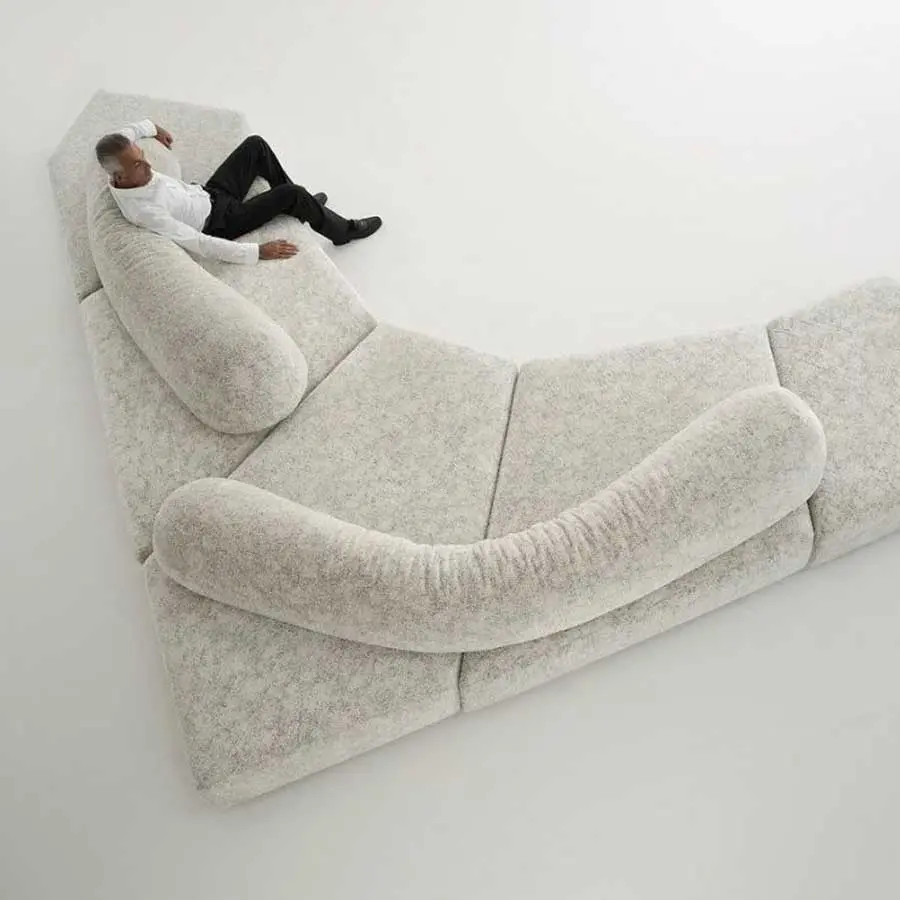Amplio, sin estructuras rígidas, con cuatro elementos de asiento de diferentes formas y dos respaldos, separados de la base y de diferentes medidas que se pueden disponer como prefieras. Un sistema de secciones que te deja libertad para expresarte y que se puede personalizar tanto como quieras. Sus piezas geométricas se pueden realizar en diferentes soluciones: combinadas en una composición o todas independientes, para cambiar la perspectiva de una habitación.