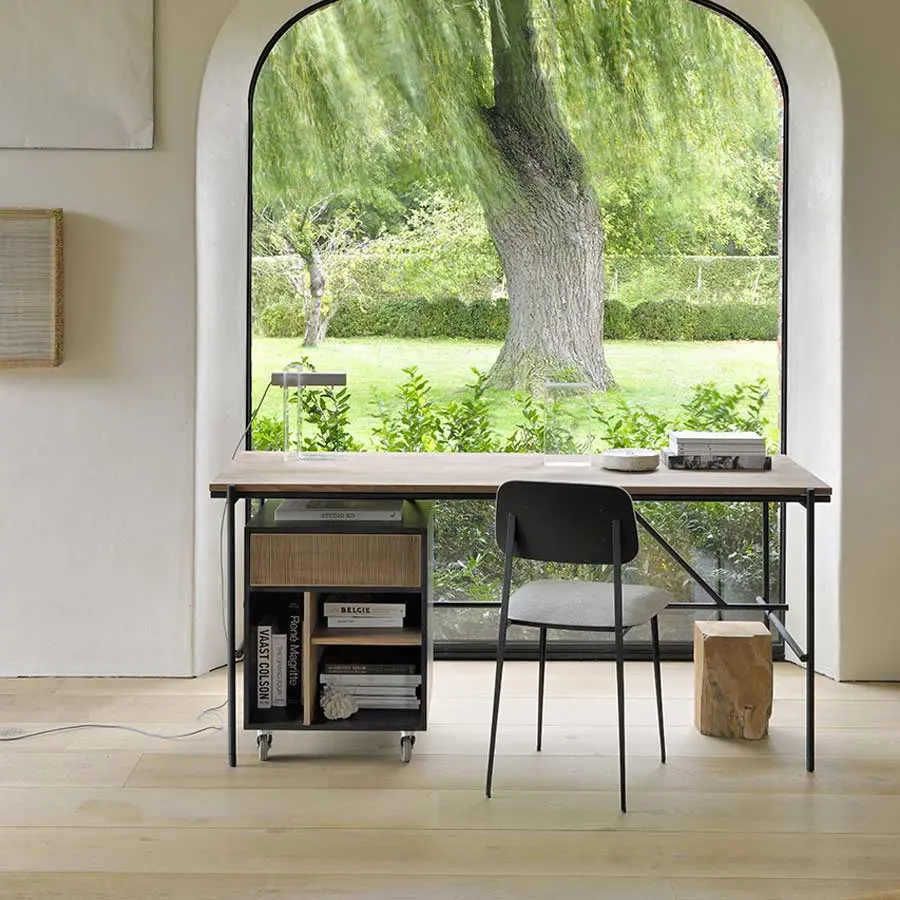 Hay quien prefiere los muebles con aspecto minimalista, otros necesitan más almacenamiento y organización. Ya que busque lo primero o lo segundo, el escritorio Oscar está disponible con o sin cajones. Diseñado por Alain van Havre y fabricado con puertas de cajón de teca talladas a mano por artesanos. La encimera puede venir en roble o teca.