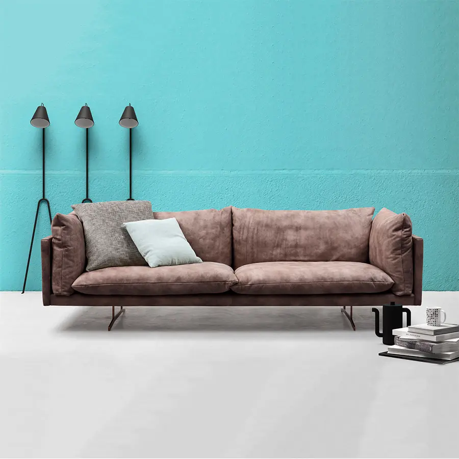 En el sofá Oslo, los mullidos rellenos se funden con la forma regular de la base y los reposabrazos. Oslo descansa con elegancia sobre patas de metal barnizado y está disponible en cinco anchos y dos variantes de sillón.