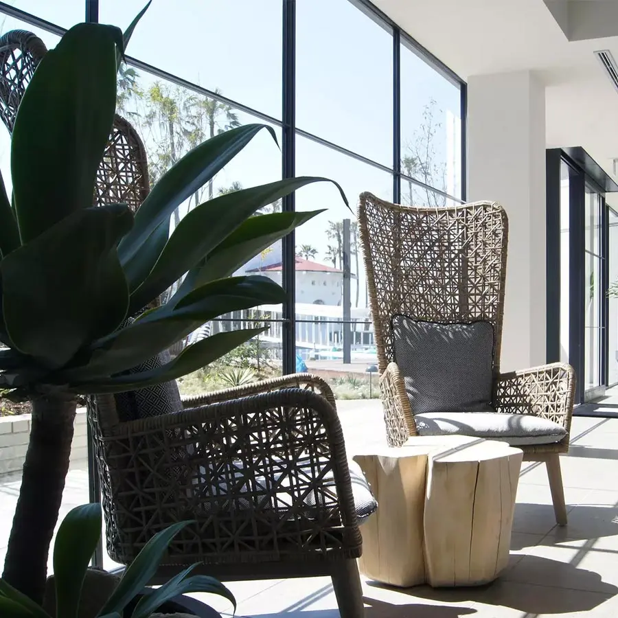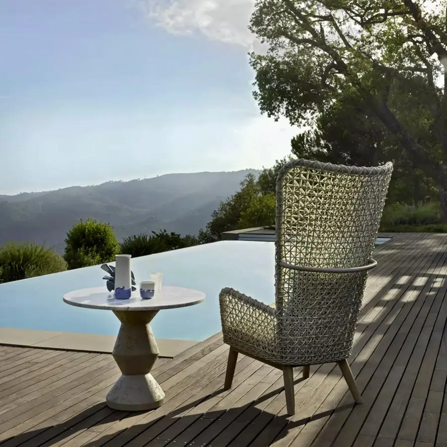 La silla Bergere Panda 19 se caracteriza por sus importantes proporciones, con reposabrazos y un gran respaldo, que se desarrolla con una altura considerable. Está fabricado con estructura y patas de aluminio y armazón de fibra sintética de polietileno Panda Resin blanco/gris. Fibras sintéticas de última generación, estarán diseñadas para resistir el agua y la luz y conservar las cualidades técnicas y cromáticas en el tiempo, manteniendo un aspecto muy natural y duradero. El asiento y el respaldo están adornados con grandes cojines con fundas extraíbles, para mejorar la comodidad.