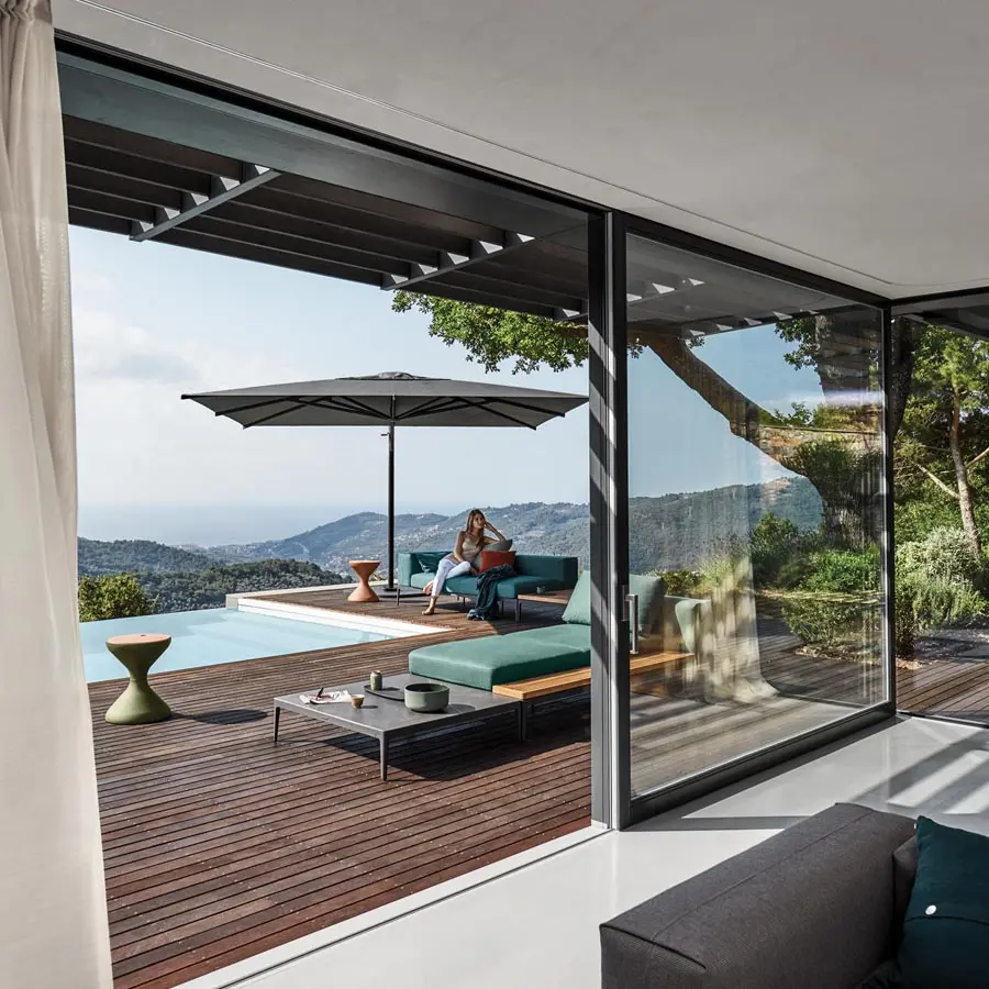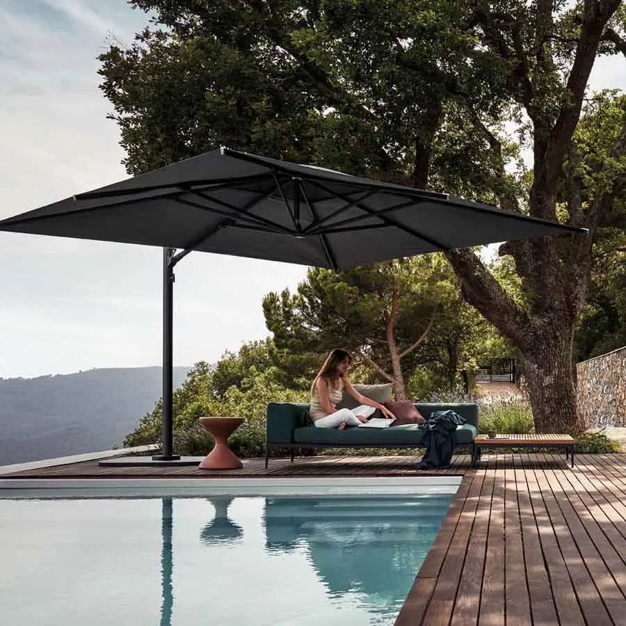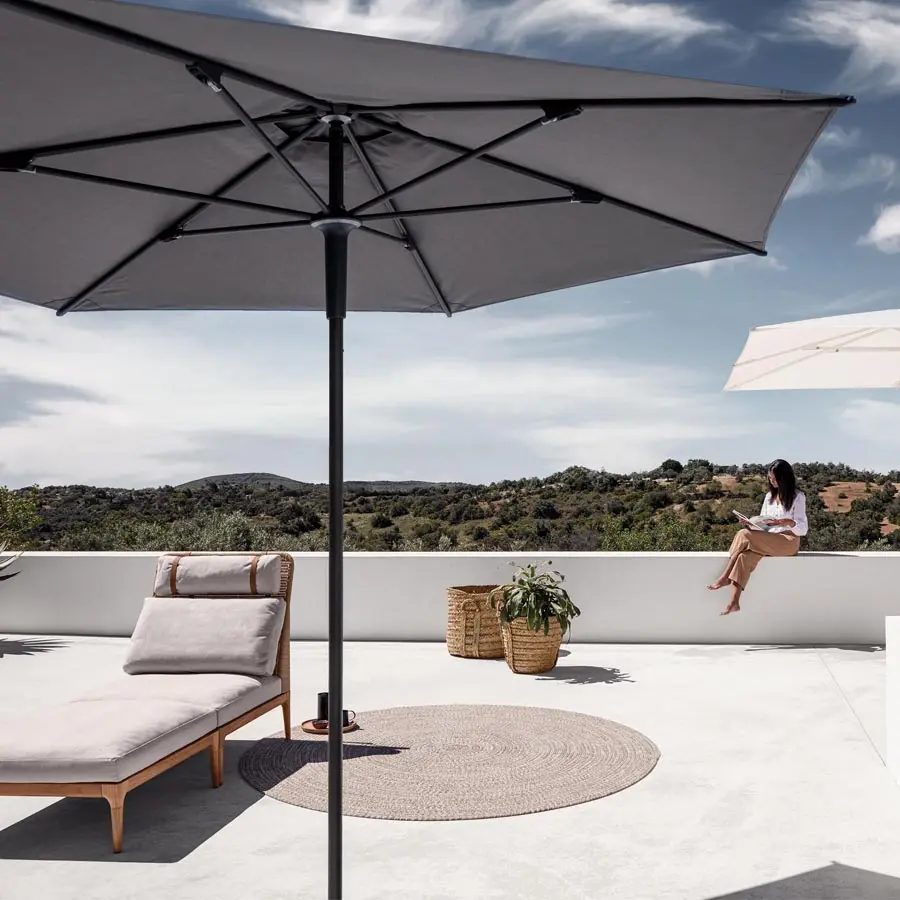 Aunque todos anhelamos la luz del sol, la sombra también tiene su propio atractivo único. La colección de sombrillas Halo cuenta con robustos marcos de aluminio y cubiertas de tela Sunbrella de alta resistencia. Disponible en versiones estándar con sistema de apertura manual y versiones prácticas con brazo de soporte, con Halo, siempre tendrás un lugar para refrescarte y alejarte del sol del mediodía.