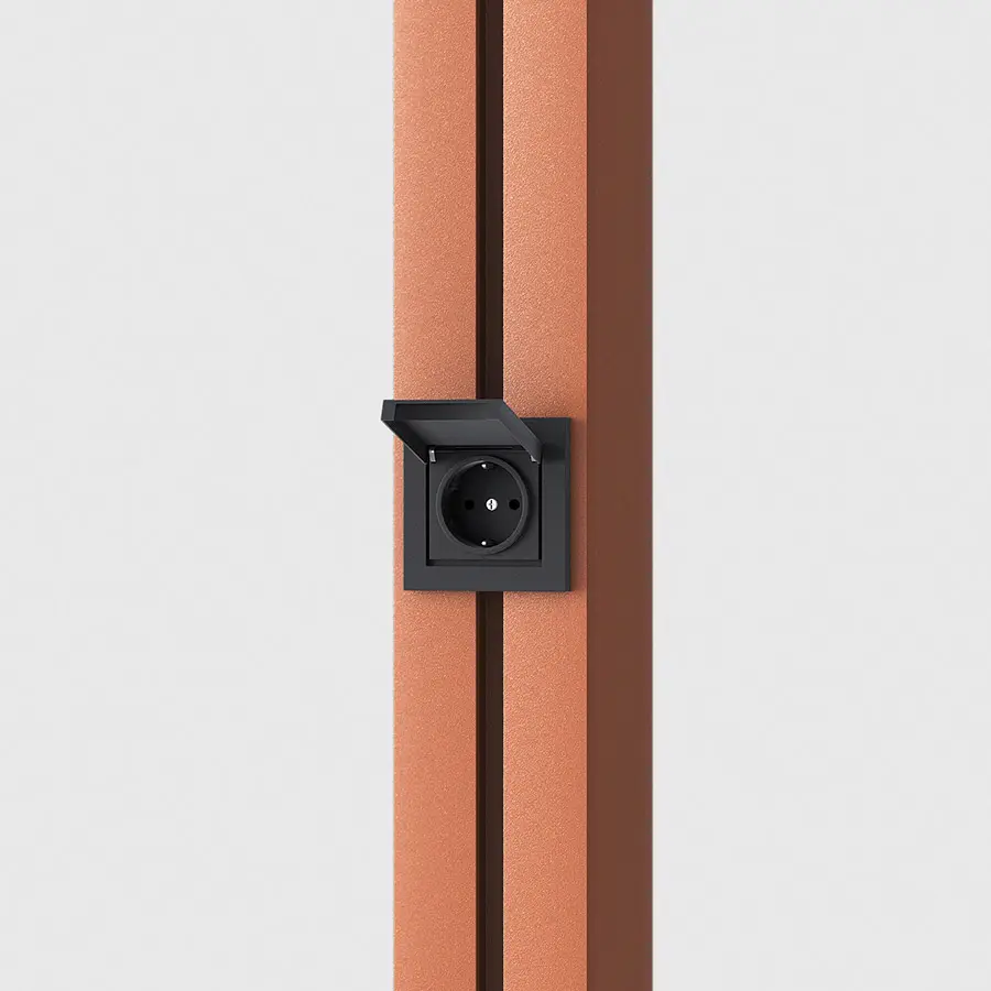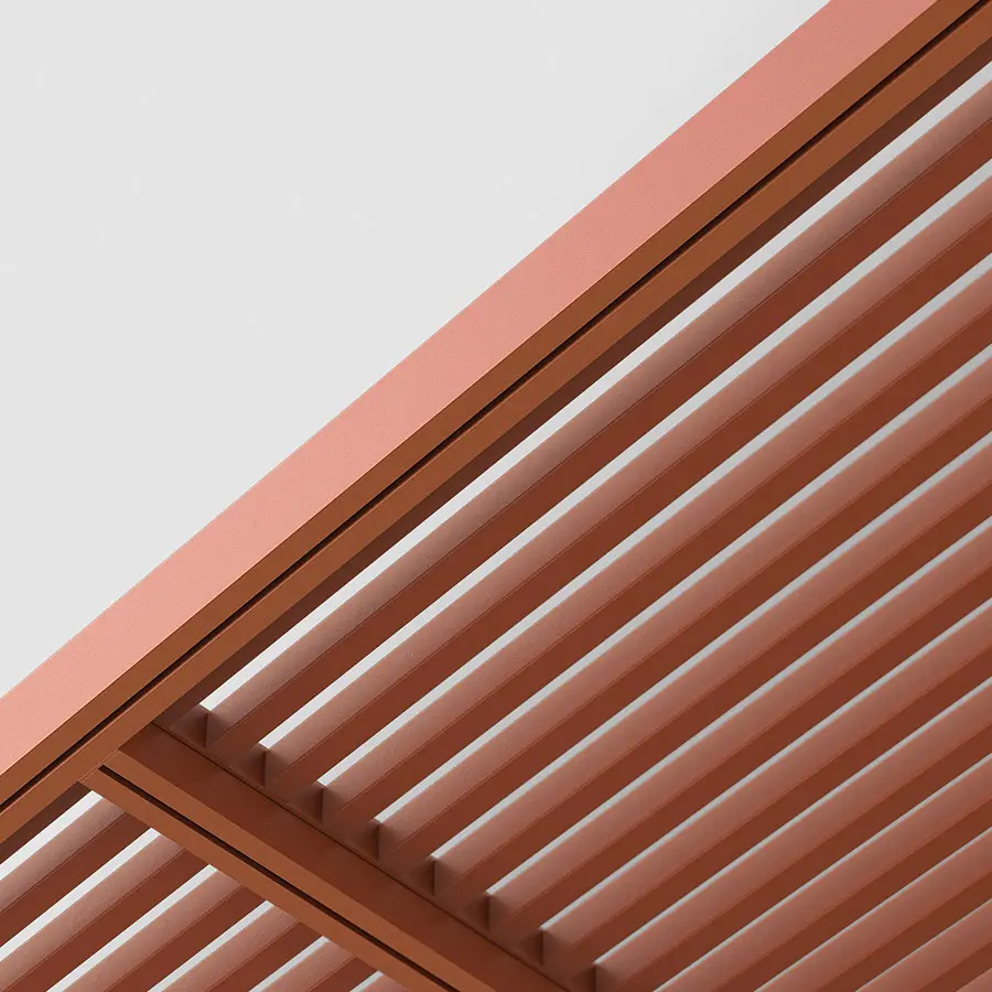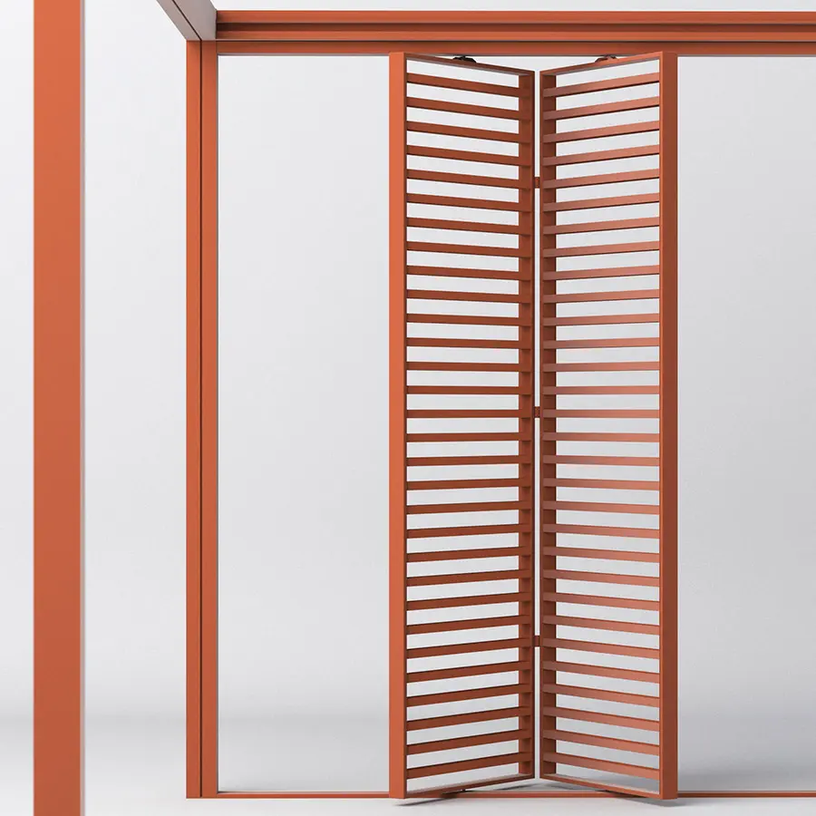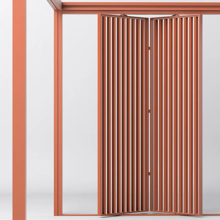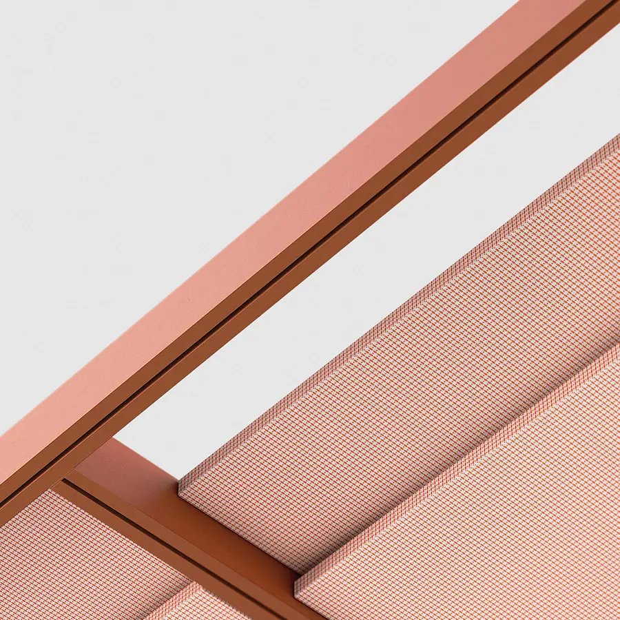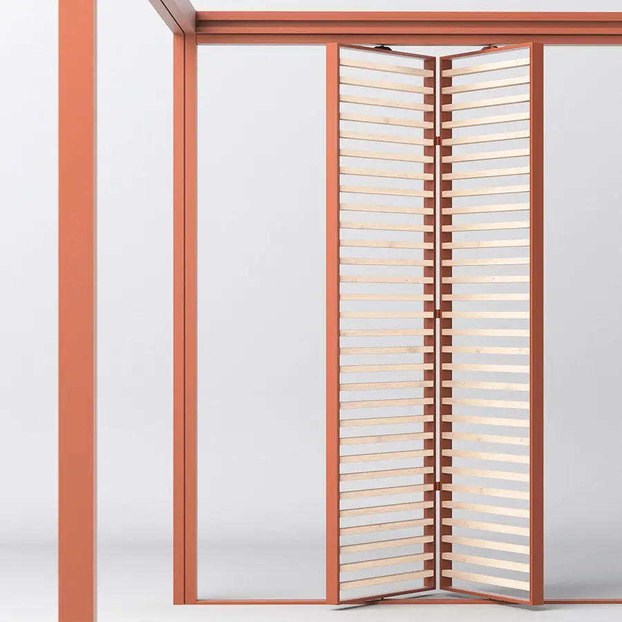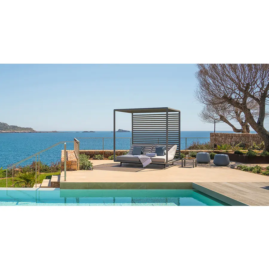 Monica Armani moderniza la clásica cama de columnas, dándole una silueta geométrica en aluminio con lacado en polvo. El sofá cama se puede configurar completamente a su gusto. Así, por ejemplo, puede elegir el panel posterior y la cubierta de aluminio o en listones de madera de teca, o en tela Sunvision deslizante, un tipo de tejido patentado que filtra los rayos solares sin bloquear la luz.