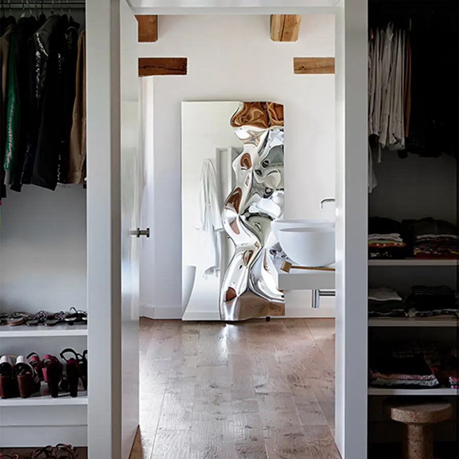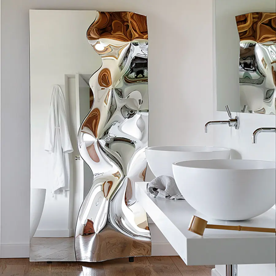 Espejo de pared en vidrio fundido a alta temperatura de 6 mm, con trasera plateada. La parte plana del espejo tiene un espesor de 5 mm. Bastidor trasero en metal pintado. Se puede colgar horizontal o verticalmente.
