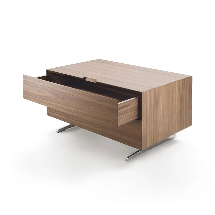 La colección de contenedores Piuma combina el rigor de la forma con la rica expresividad de la madera. La estudiada simplicidad del diseño es un contrapunto a la elección de la madera contrachapada hecha de maderas raras y preciosas, como la pluma de caoba, el ébano amara, el nogal y la ceniza, que se ofrecen en varios tonos. La ausencia de tiradores, que se ubican directamente sobre la estructura con ranuras talladas con un corte de 45°, acentúan la línea esbelta y esencial de este mueble que se presta a ser colocado en cualquier ambiente y es fácil de combinar con todas las mesas, sillas, sofás y sillones de la colección Flexform.