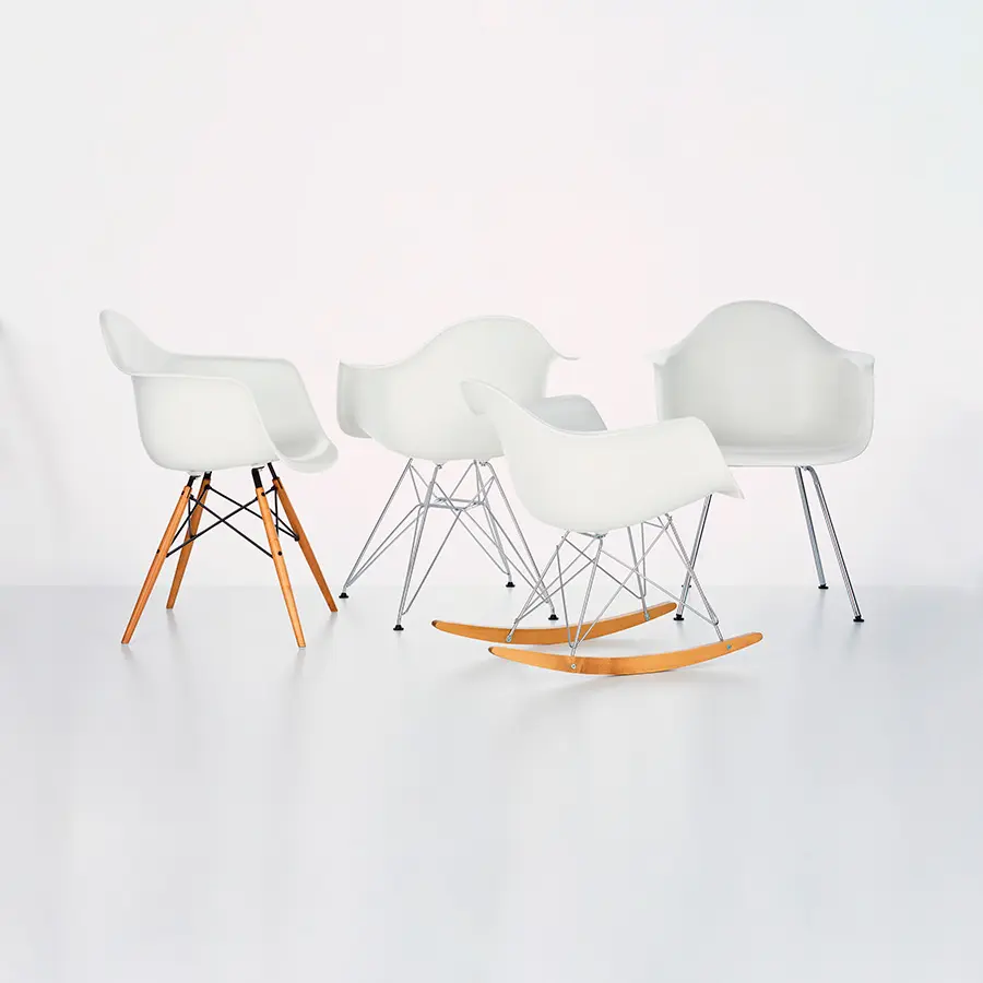 Actualmente, las Plastic Chairs de Charles y Ray Eames parecen arquetipos del género de sillas cuya carcasa puede combinarse con distintas bases. La combinación de la base de madera con la carcasa de plástico de la silla DAW (Dining Height Armchair Wood Base) ofrece un rico contraste de materiales. Las carcasas de asiento también están disponibles con un cojín de asiento o totalmente acolchadas.
